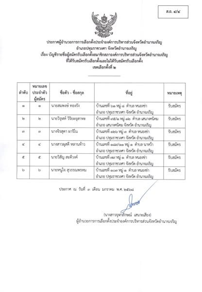 ประกาศผู้อำนวยการการเลือกตั้งประจำองค์การบริหารส่วนจังหวัดอำนาจเจริญ เรื่อง ประกาศบัญชีรายชื่อผู้สมัครรับเลือกตั้ง สมาชิกสภา อบจ.อำนาจเจริญ ผู้ที่ได้รับสมัครรับเลือกตั้งฯ และผู้ที่ไม่ได้รับสมัครรับเลือกตั้งฯ (ส.ถ.4/4 และ ส.ถ. 4/5) อำเภอชานุมาน เขตเลือกตั้งที่ 2 “เลือกตั้งท้องถิ่นร่วมกันใช้สิทธิอย่างสุจริตโปร่งใส สร้างสรรค์ประเทศไทยพร้อมใจไปเลือกตั้ง”
