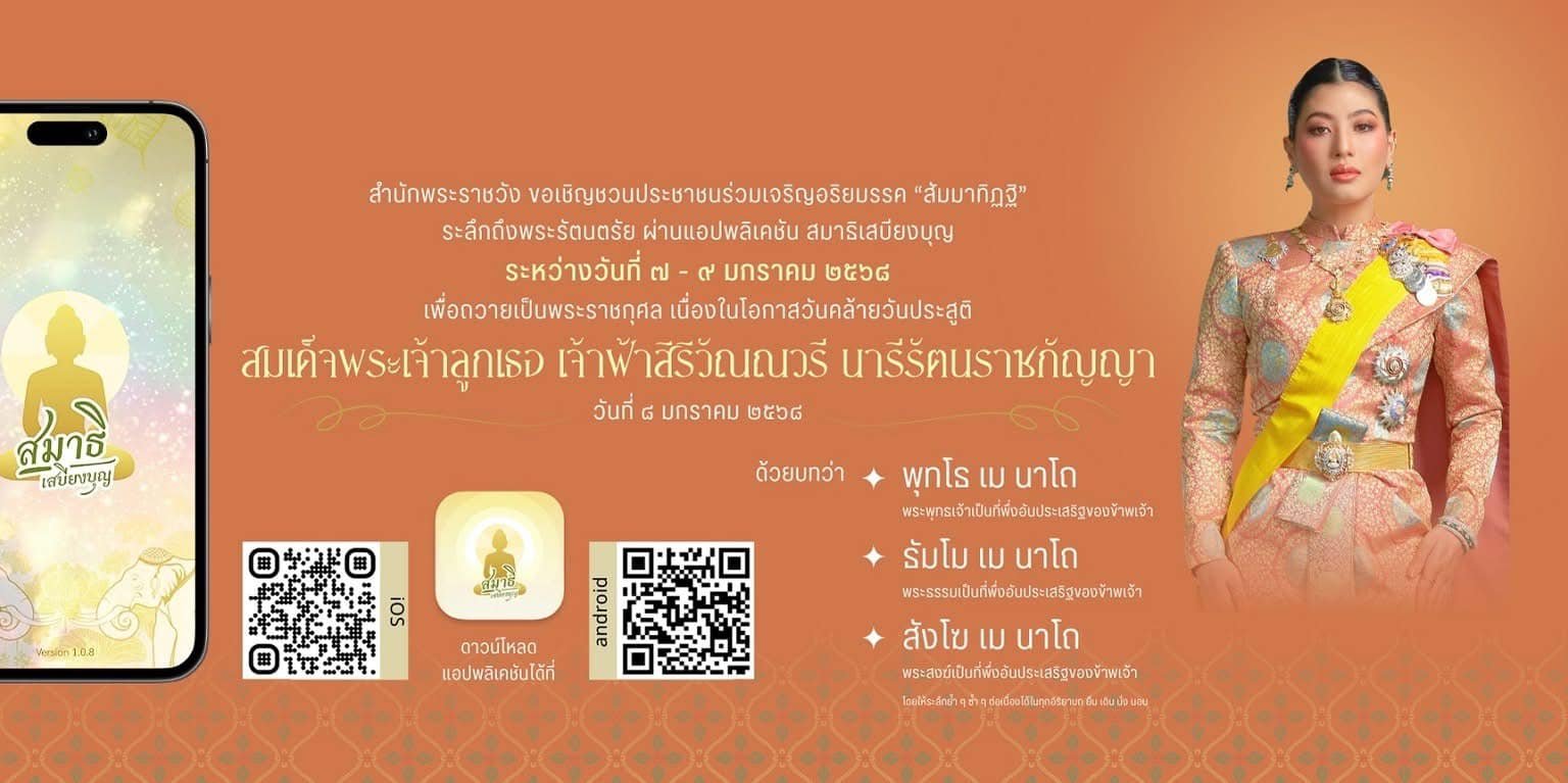 สำนักพระราชวัง ขอเชิญชวนประชาชนร่วมเจริญอริยมรรค “สัมมาทิฏฐิ” ระลึกถึงพระรัตนตรัย ว่าเป็นสรณะที่พึ่งที่ยึดถือ อันเป็นทางเป็นธรรมที่พระพุทธองค์ได้ตรัสไว้โดยชอบ เพื่อถวายเป็นพระราชกุศลเนื่องในโอกาสวันคล้ายวันประสูติ สมเด็จพระเจ้าลูกเธอ เจ้าฟ้าสิริวัณณวรี นารีรัตนราชกัญญา