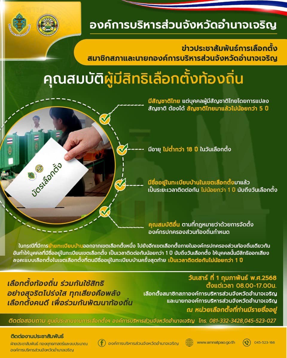 อบจ.อำนาจเจริญ | ประชาสัมพันธ์การเลือกตั้ง ขอเชิญชาวอำนาจเจริญผู้มีสิทธิเลือกตั้ง มาใช้สิทธิเลือกตั้งสมาชิกสภา และ นายก อบจ.อำนาจเจริญ ในเสาร์ที่ 1 กุมภาพันธ์ 2568 ตั้งแต่เวลา 08.00 - 17.00 น. ณ หน่วยเลือกตั้งที่ท่านมีชื่ออยู่