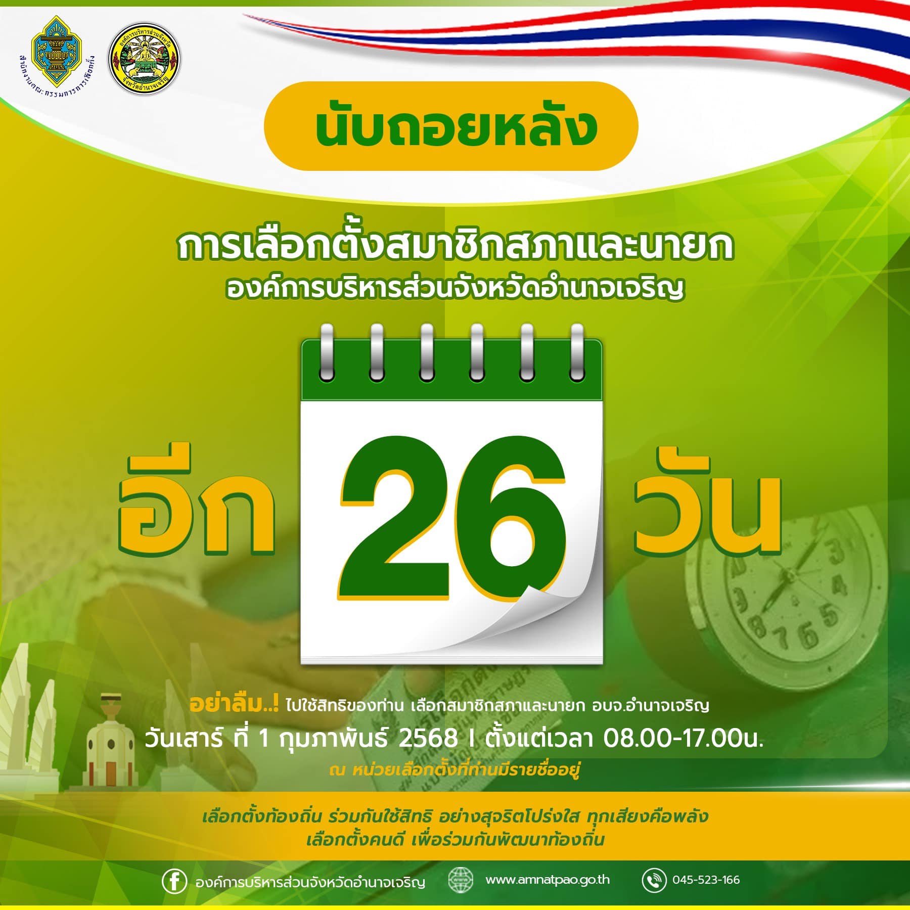 อบจ.อำนาจเจริญ | ประชาสัมพันธ์การเลือกตั้ง นับถอยหลังการเลือกตั้งสมาชิกสภา และ นายก อบจ.อำนาจเจริญ อีก 26 วัน