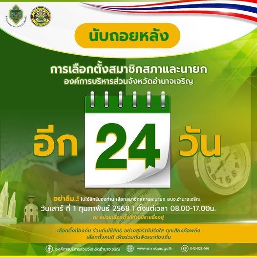 อบจ.อำนาจเจริญ | ประชาสัมพันธ์การเลือกตั้ง นับถอยหลังเหลืออีก 24 วัน ถึงวันเลือกตั้งสมาชิกสภา และ นายก อบจ.อำนาจเจริญ ในวันเสาร์ที่ 1 กุมภาพันธ์ 2568 ตั้งแต่เวลา 08.00 - 17.00 น. ณ หน่วยเลือกตั้งที่ท่านมีชื่ออยู่