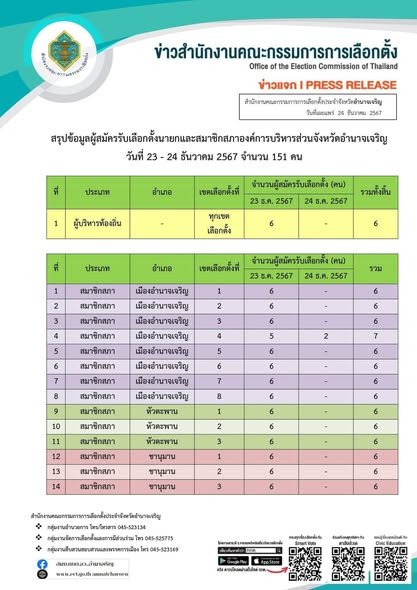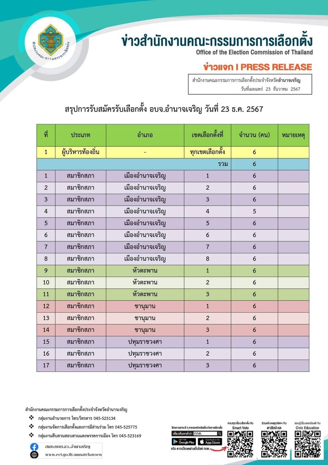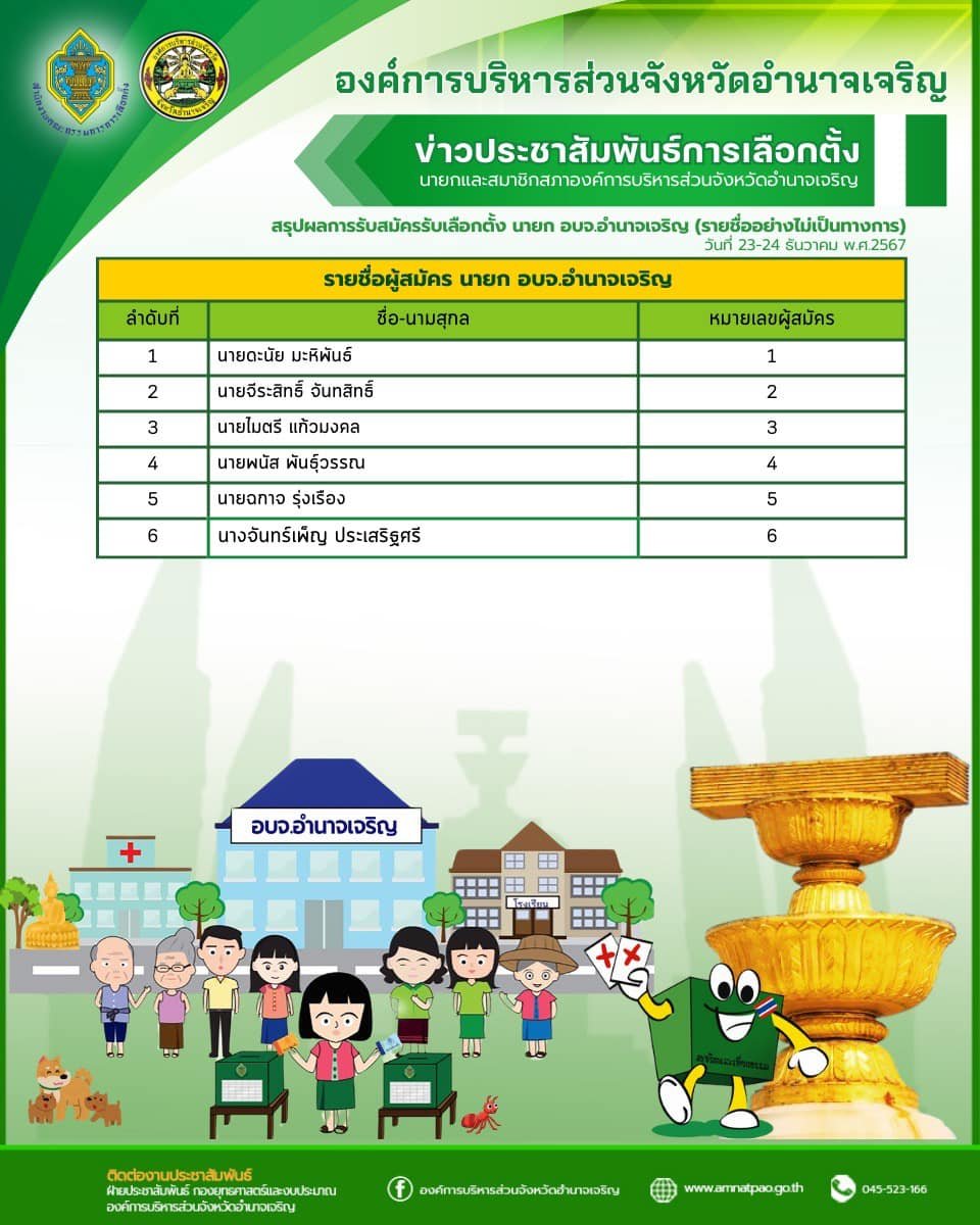 สรุปผู้สมัครรับเลือกตั้งสมาชิกสภาองค์การบริหารส่วนจังหวัดอำนาจเจริญ และนายกองค์การบริหารส่วนจังหวัดอำนาจเจริญ ประจำวันที่ 23 ธ.ค.67