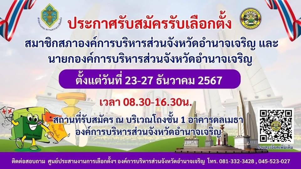 องค์การบริหารส่วนจังหวัดอำนาจเจริญ เปิดรับสมัครรับเลือกตั้งสมาชิกสภาองค์การบริหารส่วนจังหวัดอำนาจเจริญและนายกองค์การบริหารส่วนจังหวัดอำนาจเจริญ เริ่มรับสมัครตั้งแต่ วันจันทร์ที่ 23 - วันศุกร์ที่ 27 ธันวาคม 2567 (ตั้งแต่เวลา 08.30 - 16.30 น.)