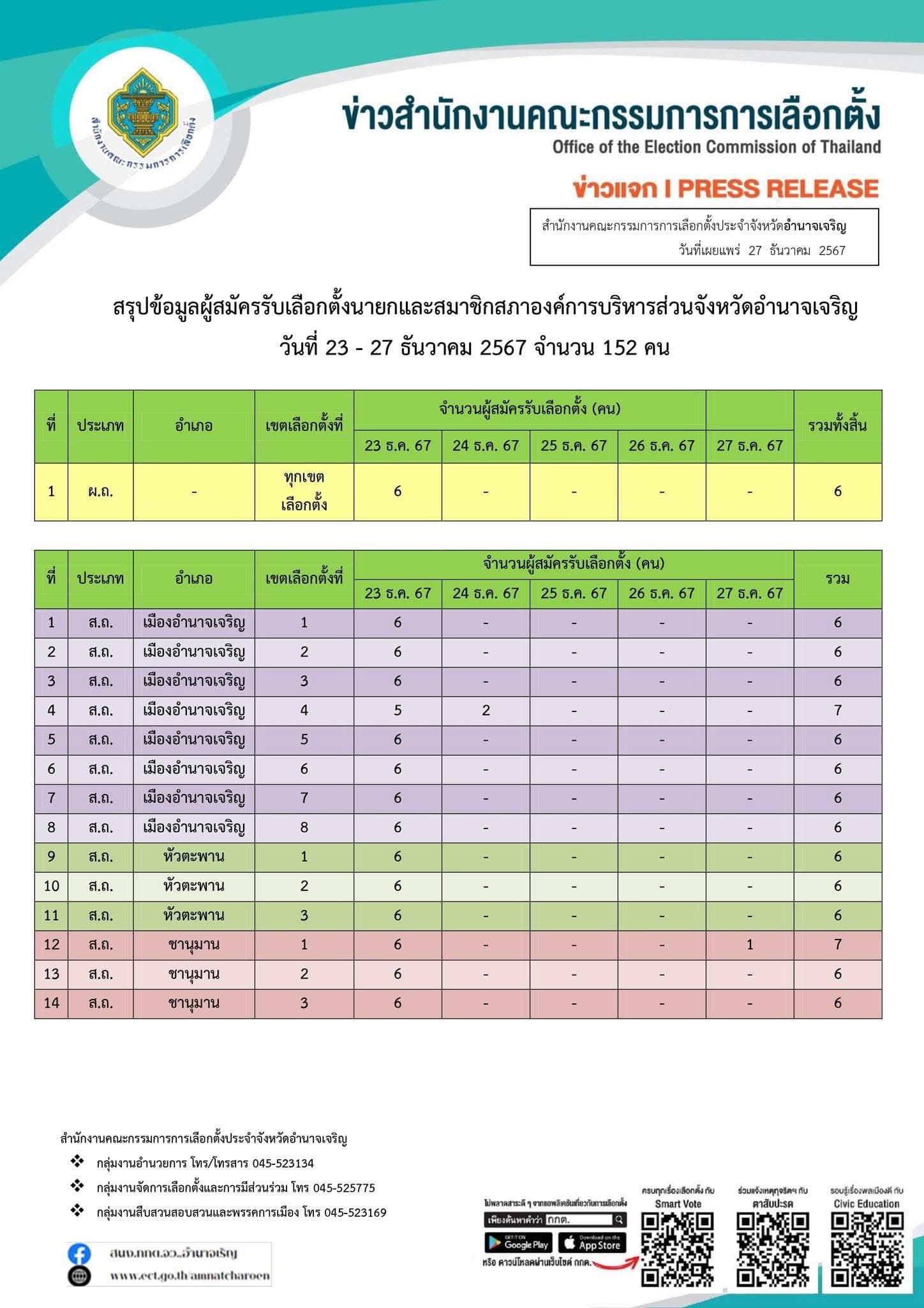 สรุปผู้สมัครรับเลือกตั้งสมาชิกสภาองค์การบริหารส่วนจังหวัดอำนาจเจริญ และนายกองค์การบริหารส่วนจังหวัดอำนาจเจริญ ในระหว่างวันที่ 23 - 27 ธ.ค.67