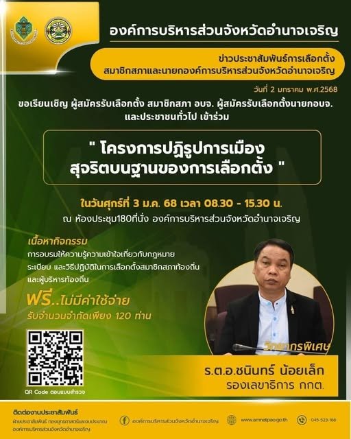 อบจ.อำนาจเจริญ ประชาสัมพันธ์การเลือกตั้ง ขอเรียนเชิญผู้สมัครรับเลือกตั้ง สมาชิกสภา อบจ.อำนาจเจริญ ผู้สมัครรับเลือกตั้งนายก อบจ.อำนาจเจริญ และประชาชนทั่วไป เข้าร่วม ”โครงการปฏิรูปการเมืองสุจริตบนฐานของการเลือกตั้ง“ ในวันศุกร์ที่ 3 มกราคม 2567 ณ ห้องประชุม 180 ที่นั่ง อาคารดลเมธา อบจ.อำนาจเจริญ