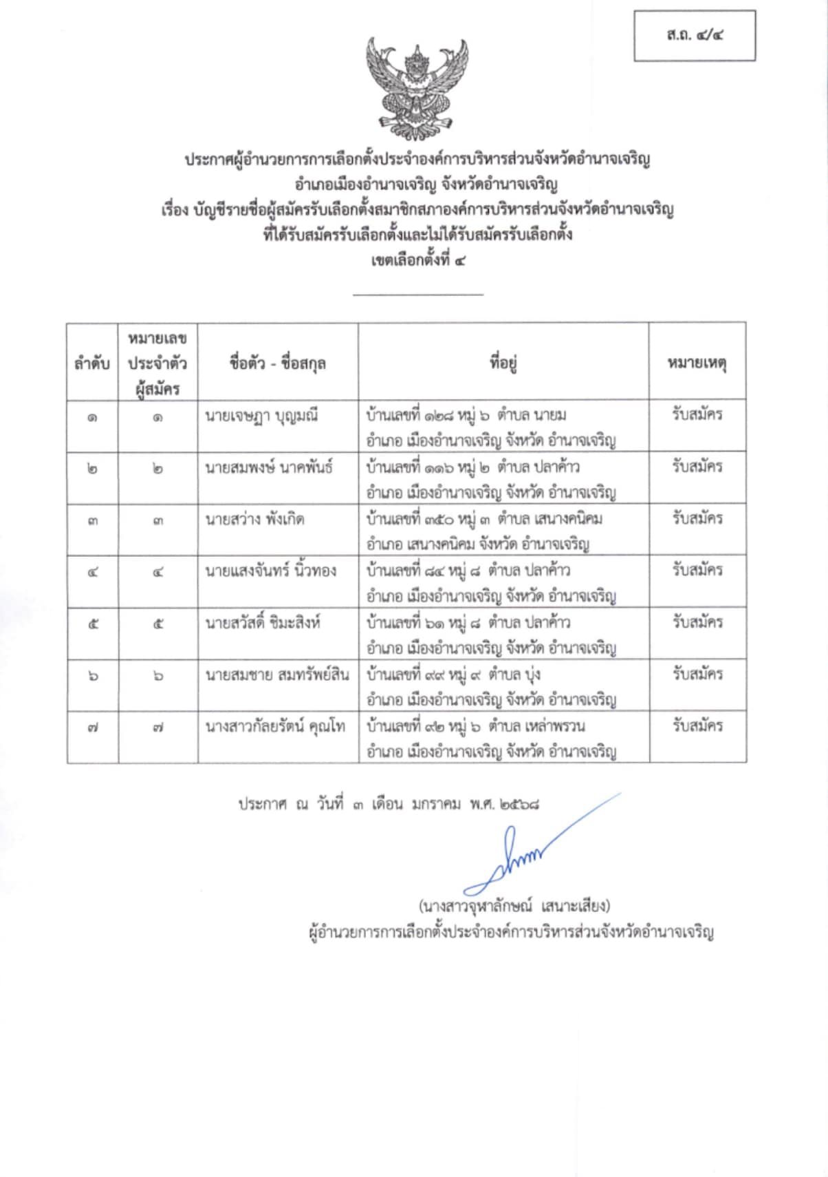 ประกาศผู้อำนวยการการเลือกตั้งประจำองค์การบริหารส่วนจังหวัดอำนาจเจริญ เรื่อง ประกาศบัญชีรายชื่อผู้สมัครรับเลือกตั้ง สมาชิกสภา อบจ.อำนาจเจริญ ผู้ที่ได้รับสมัครรับเลือกตั้งฯ และผู้ที่ไม่ได้รับสมัครรับเลือกตั้งฯ (ส.ถ.4/4 และ ส.ถ. 4/5) อำเภอเมืองอำนาจเจริญ เขตเลือกตั้งที่ 4 “เลือกตั้งท้องถิ่นร่วมกันใช้สิทธิอย่างสุจริตโปร่งใส สร้างสรรค์ประเทศไทยพร้อมใจไปเลือกตั้ง”