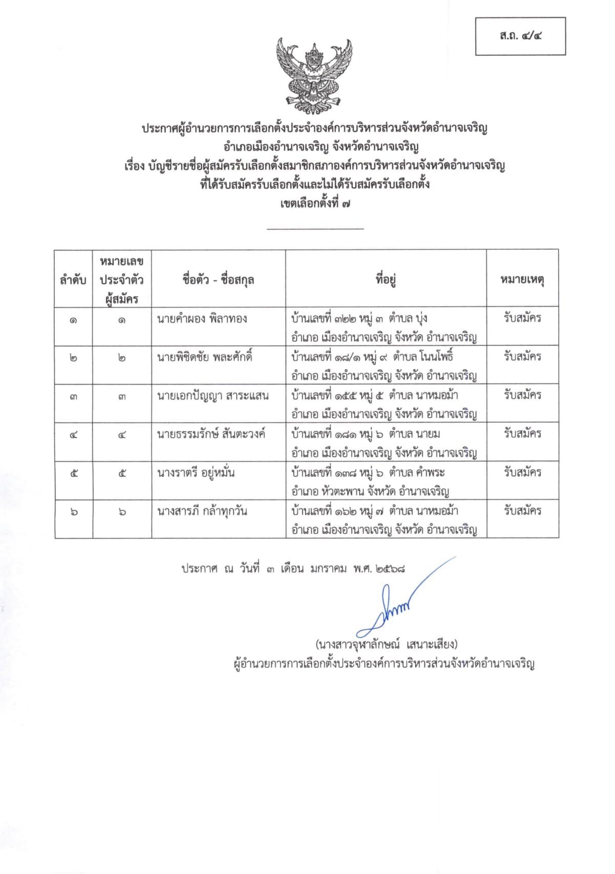 ประกาศผู้อำนวยการการเลือกตั้งประจำองค์การบริหารส่วนจังหวัดอำนาจเจริญ เรื่อง ประกาศบัญชีรายชื่อผู้สมัครรับเลือกตั้ง สมาชิกสภา อบจ.อำนาจเจริญ ผู้ที่ได้รับสมัครรับเลือกตั้งฯ และผู้ที่ไม่ได้รับสมัครรับเลือกตั้งฯ (ส.ถ.4/4 และ ส.ถ. 4/5) อำเภอเมืองอำนาจเจริญ เขตเลือกตั้งที่ 7 “เลือกตั้งท้องถิ่นร่วมกันใช้สิทธิอย่างสุจริตโปร่งใส สร้างสรรค์ประเทศไทยพร้อมใจไปเลือกตั้ง”