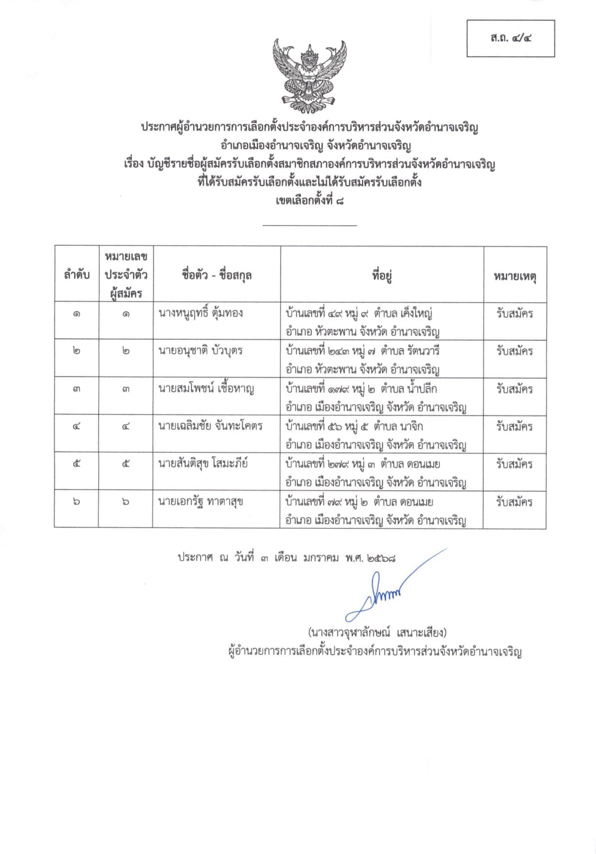 ประกาศผู้อำนวยการการเลือกตั้งประจำองค์การบริหารส่วนจังหวัดอำนาจเจริญ เรื่อง ประกาศบัญชีรายชื่อผู้สมัครรับเลือกตั้ง สมาชิกสภา อบจ.อำนาจเจริญ ผู้ที่ได้รับสมัครรับเลือกตั้งฯ และผู้ที่ไม่ได้รับสมัครรับเลือกตั้งฯ (ส.ถ.4/4 และ ส.ถ. 4/5) อำเภอเมืองอำนาจเจริญ เขตเลือกตั้งที่ 8 “เลือกตั้งท้องถิ่นร่วมกันใช้สิทธิอย่างสุจริตโปร่งใส สร้างสรรค์ประเทศไทยพร้อมใจไปเลือกตั้ง”