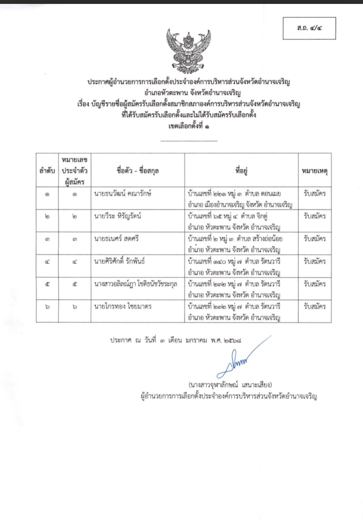 ประกาศผู้อำนวยการการเลือกตั้งประจำองค์การบริหารส่วนจังหวัดอำนาจเจริญ เรื่อง ประกาศบัญชีรายชื่อผู้สมัครรับเลือกตั้ง สมาชิกสภา อบจ.อำนาจเจริญ ผู้ที่ได้รับสมัครรับเลือกตั้งฯ และผู้ที่ไม่ได้รับสมัครรับเลือกตั้งฯ (ส.ถ.4/4 และ ส.ถ. 4/5) อำเภอเมืองอำนาจเจริญ เขตเลือกตั้งที่ 6 “เลือกตั้งท้องถิ่นร่วมกันใช้สิทธิอย่างสุจริตโปร่งใส สร้างสรรค์ประเทศไทยพร้อมใจไปเลือกตั้ง”
