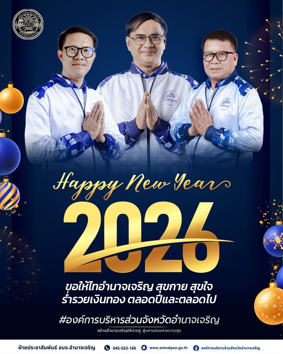 เนื่องในศุภวาระขึ้นปีใหม่ 2569 ขออำนวยพรให้ท่าน มีความสุข ความเจริญ มีสุขภาพกายใจที่แข็งแรง และมีความร่มเย็นเป็นสุขตลอดปีใหม่ Happy New Year 2026 “อบจ.อำนาจเจริญ ร่วมสร้างอำนาจเจริญให้น่าอยู่ สู่…มหานครแห่งความสุข”