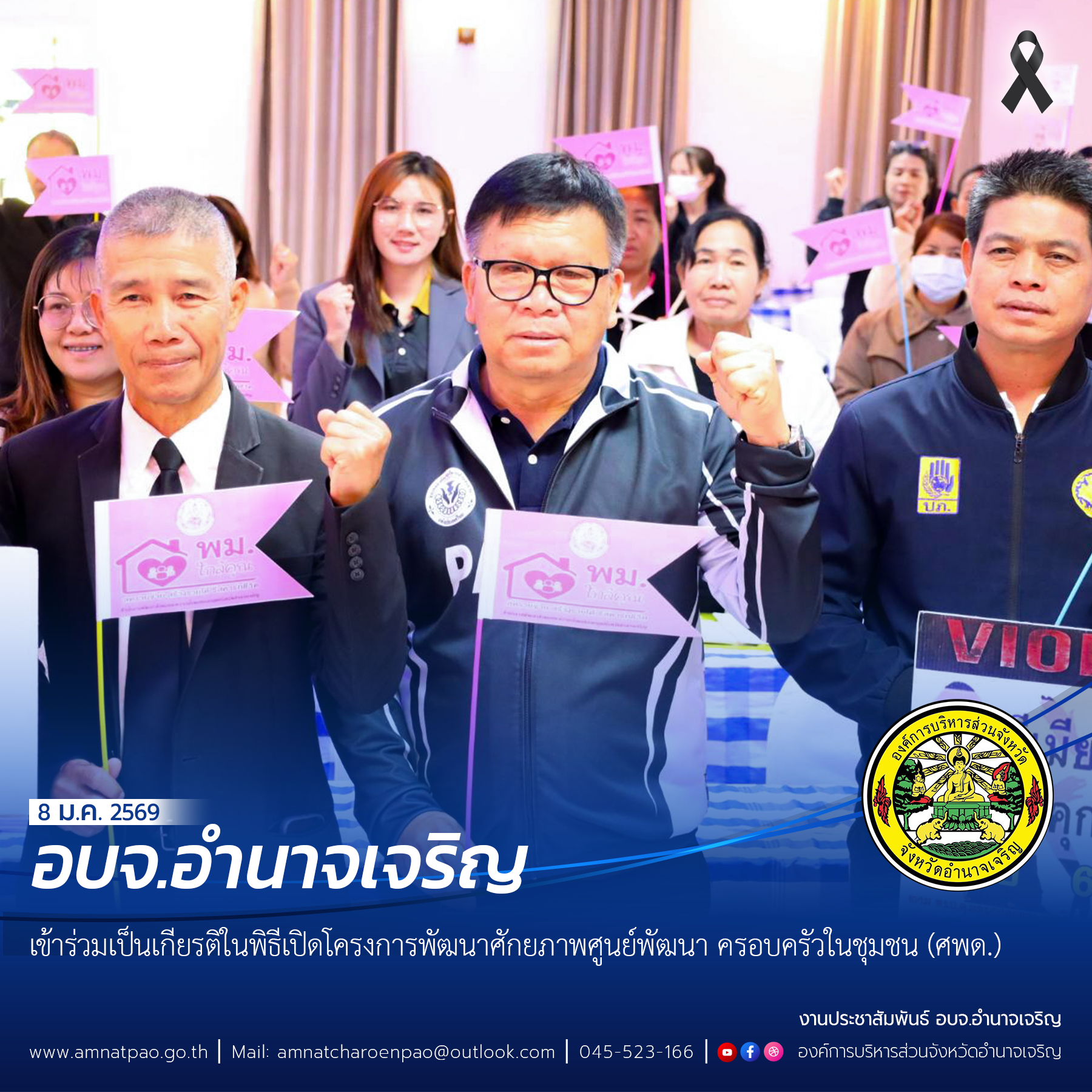 วันที่ 8 มกราคม 2569 เวลา 08.30 น. อบจ.อำนาจเจริญ ร่วมเป็นเกียรติในพิธีเปิดโครงการพัฒนาศักยภาพศูนย์พัฒนาครอบครัวในชุมชน (ศพด.)