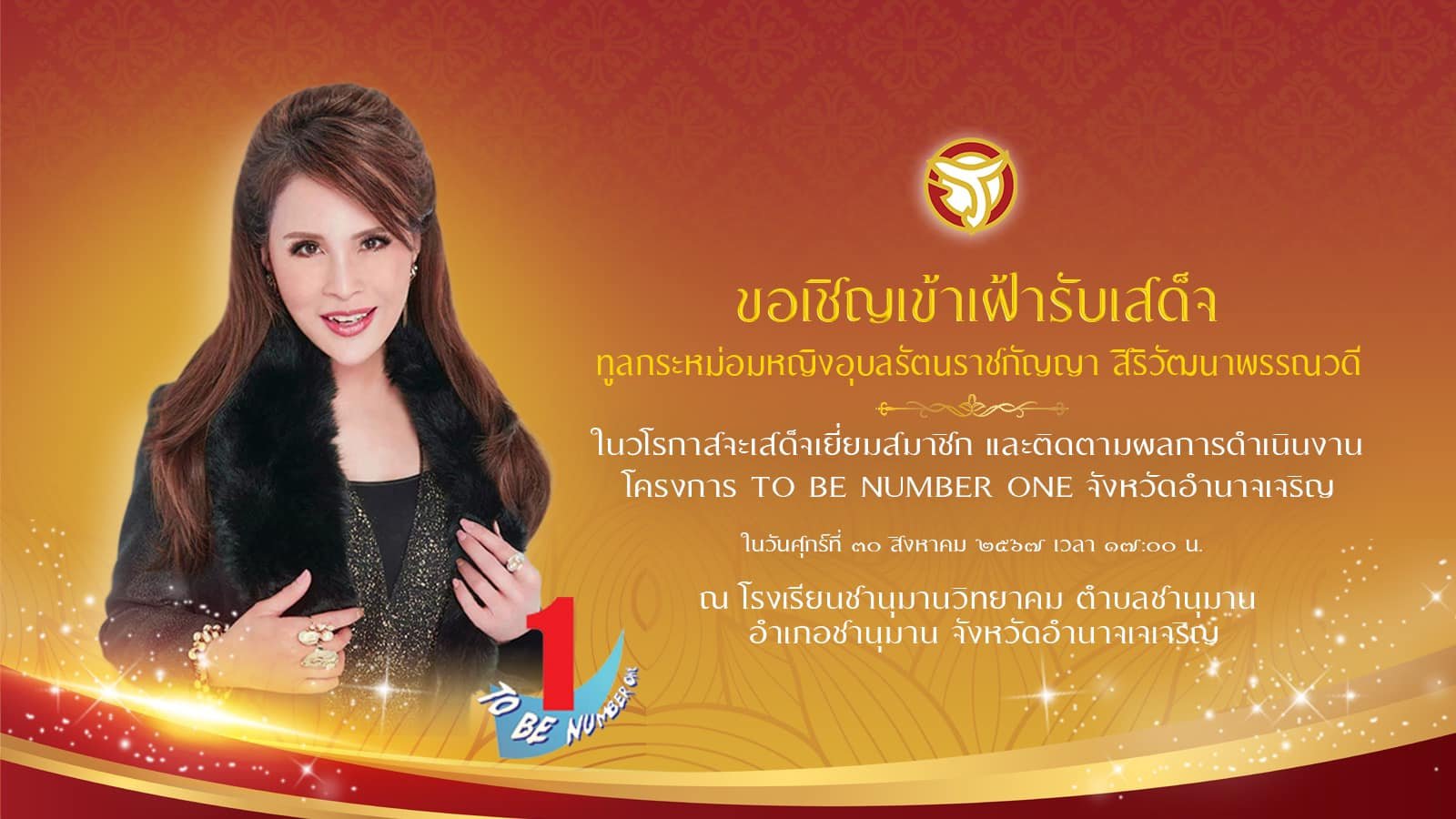 ขอเชิญเฝ้ารับเสด็จ ทูลกระหม่อมหญิงอุบลรัตนราชกัญญา สิริวัฒนาพรรณวดี ในวโรกาสเสด็จเยี่ยมสมาชิกและติดตามผลการดำเนินงานโครงการ TO BE NUMBER ONE ของจังหวัดอำนาจเจริญ ในวันศุกร์ที่ 30 สิงหาคม 2567 ณ โรงเรียนชานุมานวิทยาคม อำเภอชานุมาน จังหวัดอำนาจเจริญ