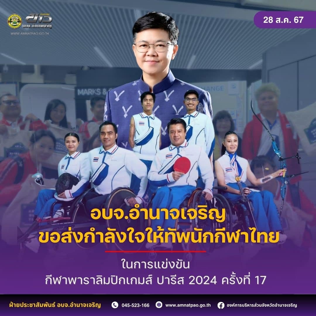 อบจ.อำนาจเจริญ ขอส่งกำลังใจให้ทัพนักกีฬาไทย ในการแข่งขันกีฬาพาราลิมปิกเกมส์ ปารีส 2024 ครั้งที่ 17 #องค์การบริหารส่วนจังหวัดอำนาจเจริญ #ภูมิใจรับใช้ประชาชน #ฝ่ายประชาสัมพันธ์ #กองยุทธศาสตร์และงบประมาณ www.amnatpao.go.th โทร.045-523166, แฟกส์ : 045 - 523166,045 - 523227