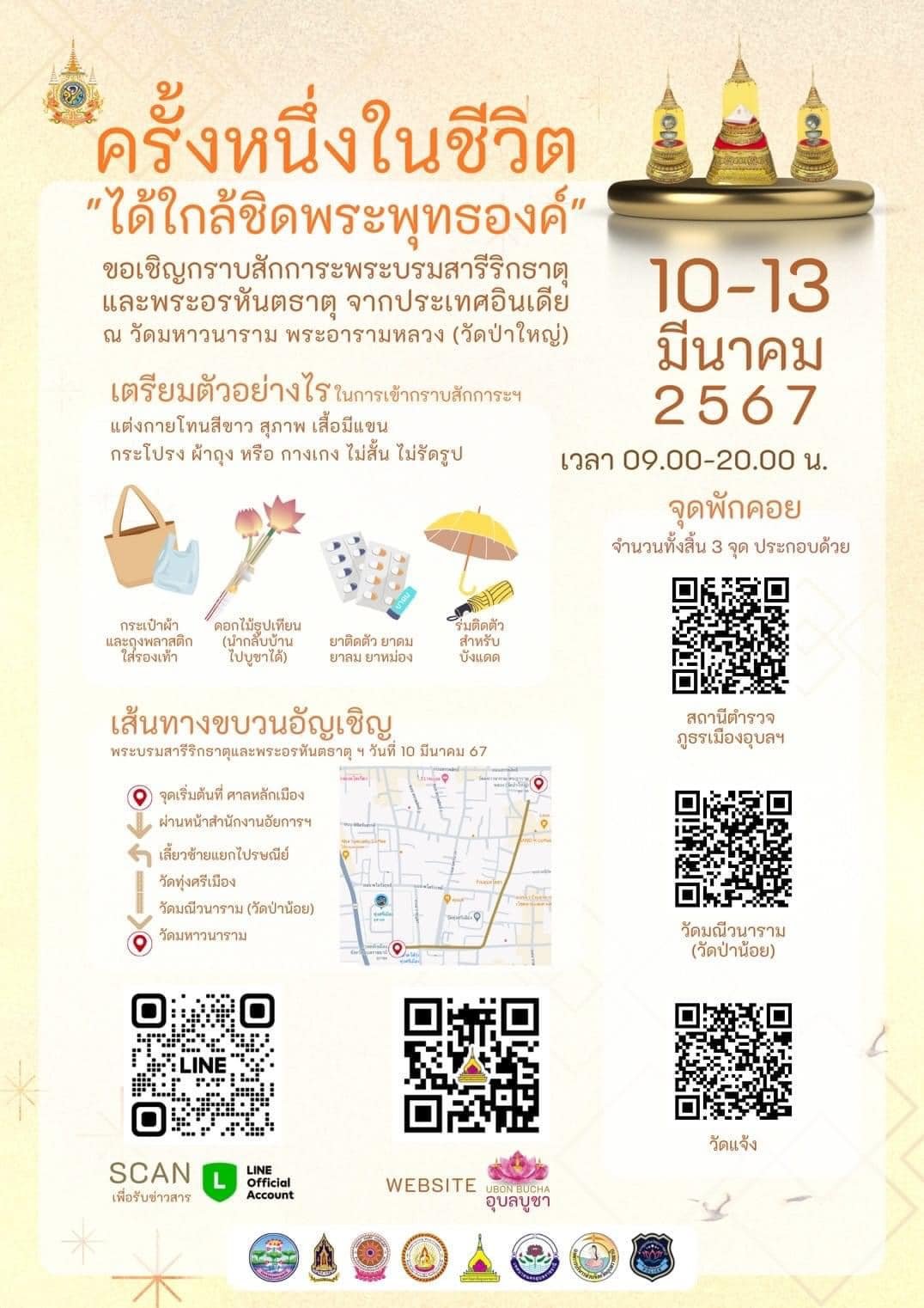 ครั้งหนึ่งในชีวิต ได้ใกล้ชิดพระพุทธองค์" ขอเชิญกราบสักการะพระบรมสารีริกธาตุและพระอรหันตธาตุ จากประเทศอินเดีย ณ วัดมหาวนาราม พระอารามหลวง (วัดป่าใหญ่) อ.เมือง จ.อุบลราชธานี ระหว่างวันที่ ๑๐-๑๓ มีนาคม ๒๕๖๗ เวลา ๐๙.๐๐-๒๐.๐๐ น.