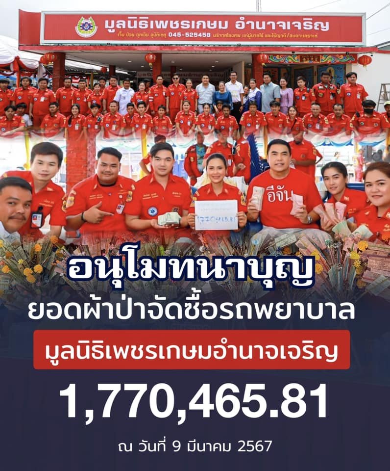 9 มี.ค.67 เวลา 10.00 น. อบจ.อำนาจเจริญ ร่วมทำบุญผ้าป่าสามัคคีมูลนิธิเพชรเกษมอำนาจเจริญ เพื่อสมทบทุนจัดซื้อรถพยาบาลฉุกเฉินและอุปกรณ์ช่วยชีวิต