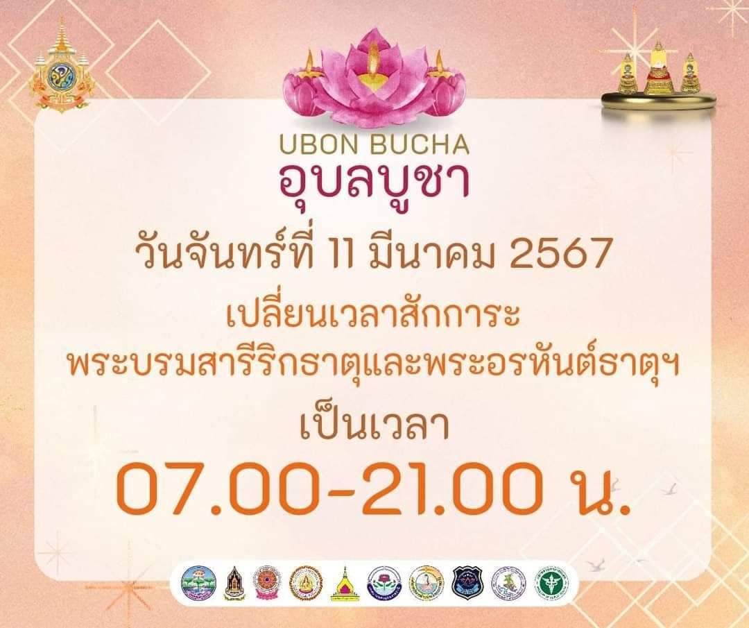 11 มีนาคม 2567 จังหวัดอุบลราชธานี ขอประชาสัมพันธ์แจ้งเปลี่ยนเวลาเข้าสักการะพระบรม สารีริกธาตุและพระอรหันตธาตุฯ ณ วัดมหาว สามารถ เข้าสักการะฯ ได้ตั้งแต่เวลา 07.00 - 21.00 น. จึงขอประกาศมาให้ทราบโดยทั่วกันนาราม จ.อุบลราชธานี