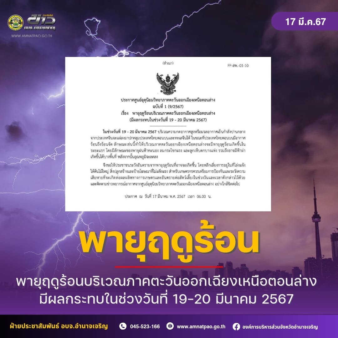 กรมอุตุฯ ประกาศเตือน ฉบับที่ 1 เตรียมรับมือ พายุฤดูร้อน ถล่มไทย (ภาคตะวันออกเฉียงเหนือตอนล่าง)19-20 มี.ค.นี้ เกิดฝนตก-ลมแรง บางพื้นที่มีลูกเห็บ จากนั้นอากาศจะเย็นลง