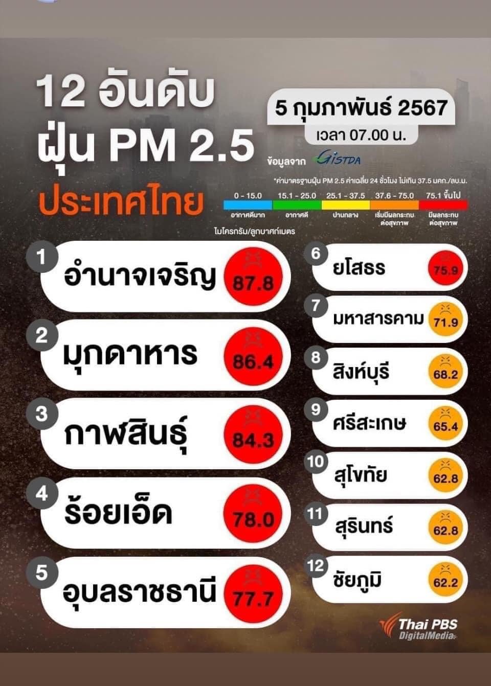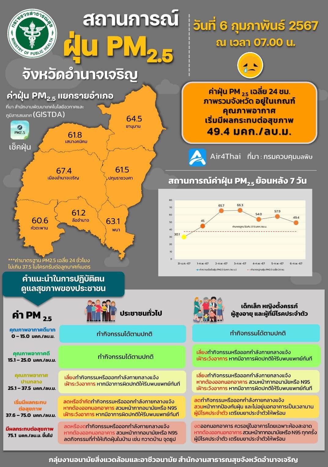 ประจำวันที่ 6 กุมภาพันธ์ 2567 เวลา 07.00 น. รายงานสถานการณ์ ฝุ่น PM 2.5 จังหวัดอำนาจเจริญ