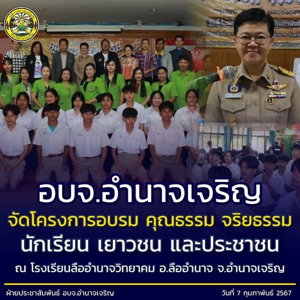 7 ก.พ.67 เวลา 10.00 น. อบจ.อำนาจเจริญ จัดโครงการอบรมคุณธรรม จริยธรรม นักเรียน เยาวชน และประชาชน ประจำปี 2567