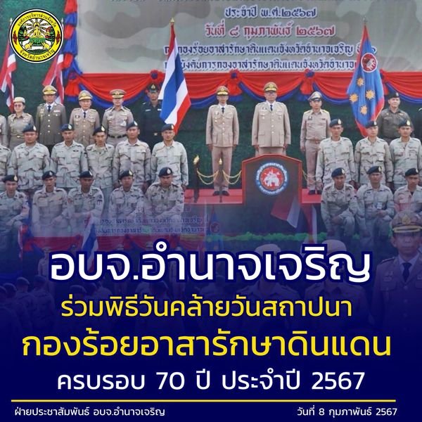 8 กุมภาพันธ์ 2567 เวลา 09.30 น. อบจ.อำนาจเจริญ ร่วมพิธีวันคล้ายวันสถาปนากองอาสารักษาดินแดน ครบรอบ70ปี ประจำปี 2567