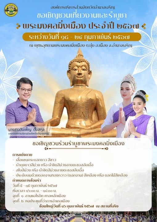 ขอเชิญร่วมรำบูชาพระมงคลมิ่งเมือง ปีที่ 9 ในพิธีงานนมัสการพระมงคลมิ่งเมือง ประจำปี 2567 วันอาทิตย์ที่ 18 กุมภาพันธ์ 2567 ณ ลานพุทธอุทยานพระมงคลมิ่งเมือง จ.อำนาจเจริญ