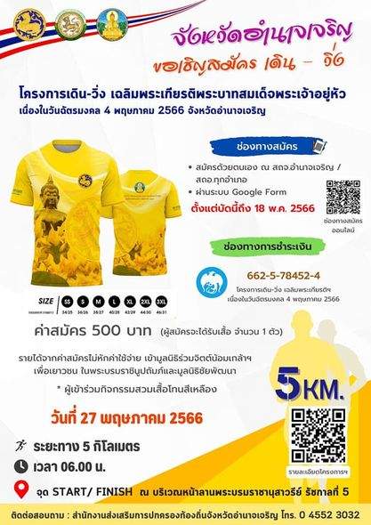 องค์การบริหารส่วนจังหวัดอำนาจเจริญ ขอเชิญร่วมสมัครเดิน-วิ่ง เฉลิมพระเกียรติ พระบาทสมเด็จพระเจ้าอยู่หัว ในวันเสาร์ที่ 27 พฤษภาคม 2566 ผู้ที่สนใจสามารถสมัครด้วยตนเอง ณ สำนักงานส่งเสริมการปกครองท้องถิ่น ทุกอำเภอ หรือ ช่องทางออนไลน์ ได้ตั้งแต่บัดนี้ จนถึงวันที่ 18 พ.ค. 66 นี้ สนใจสอบถามข้อมูลเพิ่มเติมได้ที่สำนักงานส่งเสริมการปกครองท้องถิ่นจังหวัดอำนาจเจริญ ศาลากลางจังหวัดอำนาจเจริญ ชั้น 3 045523032