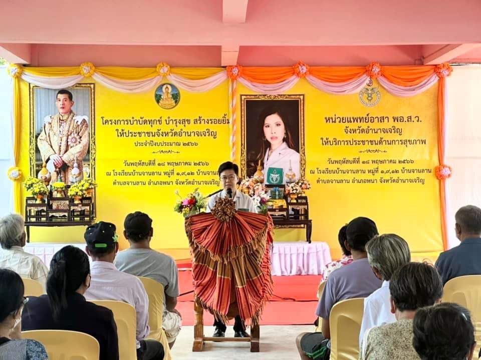 18 พฤษภาคม 2566 เวลา 08.00 น. นางสาววันเพ็ญ ตั้งสกุล นายกองค์การบริหารส่วนจังหวัดอำนาจเจริญ พร้อมด้วยหัวหน้าส่วนราชการ และเจ้าหน้าที่ในสังกัด ร่วมกิจกรรมโครงการบำบัดทุกข์ บำรุงสุข สร้างรอยยิ้ม ให้ประชาชน จังหวัดอำนาจเจริญ และ ออกหน่วยแพทย์อาสา พอ.สว. จังหวัดอำนาจเจริญ เพื่อให้บริการประชาชนด้านการรักษาสุขภาพ ประจำเดือน พฤษภาคม 2566 ณ โรงเรียนจานลาน อำเภอพนา จังหวัดอำนาจเจริญ โดยมีนายชนาส ชัชวาลวงศ์ ผู้ว่าราชการจังหวัดอำนาจเจริญเป็นประธานในพิธี