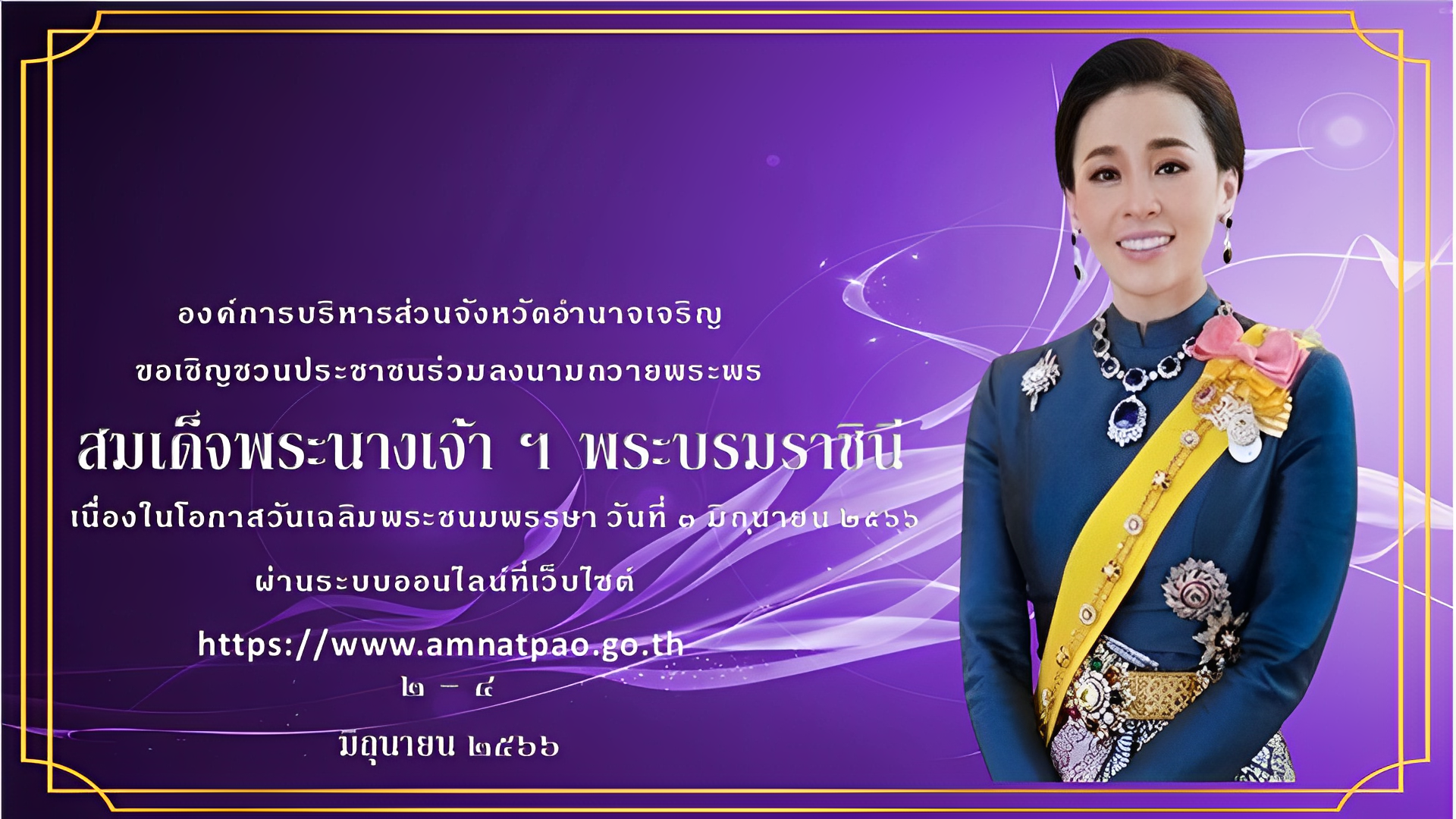 องค์การบริหารส่วนจังหวัดอำนาจเจริญ ขอเชิญชวนประชาชนร่วมลงนามถวายพระพร สมเด็จพระนางเจ้า ฯ พระบรมราชินี เนื่องในโอกาสวันเฉลิมพระชนมพรรษา วันที่ ๓ มิถุนายน ๒๕๖๖ ผ่านระบบออนไลน์