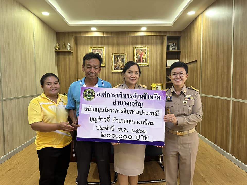 นางสาววันเพ็ญ ตั้งสกุล นายกองค์การบริหารส่วนจังหวัดอำนาจเจริญ ในนาม อบจ.อำนาจเจริญ มอบเงินอุดหนุนสำนักงานวัฒนธรรมอำเภอเสนางคนิคม จำนวน 200,000 บาท (สองแสนบาทถ้วน) เพื่อสืบสานประเพณีบุญข้าวจี่ อำเภอเสนางคนิคม ประจำปี พ.ศ.2566 การจัดงานในครั้งนี้เพื่อเป็นการสืบสาน วัฒนธรรมประเพณี อันดีงาม รักษาไว้ซึ่งความงดงามในท้องถิ่นของพี่น้องชาวเสนางคนิคม