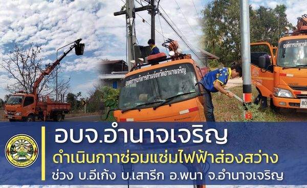 อบจ.อำนาจเจริญ ดำเนินการซ่อมแซ่มไฟฟ้าส่องสว่าง นางสาววันเพ็ญ ตั้งสกุล นายกองค์การบริหารส่วนจังหวัดอำนาจเจริญ มอบหมายให้นายชนัต สมสอางค์ ผู้อำนวยกาตกองช่าง สั่งการให้นายทรงศักดิ์ บุญสม หัวหน้าฝ่ายผังเมือง และเจ้าหน้าที่กองช่าง ดำเนินการซ่อมแซ่มไฟฟ้าส่องสว่าง ช่วงบ้านอีเก้ง และบ้านเสารีก อ.พนา จ.อำนาจเจริญ เพื่อความปลอดภัยทางท้องถนน
