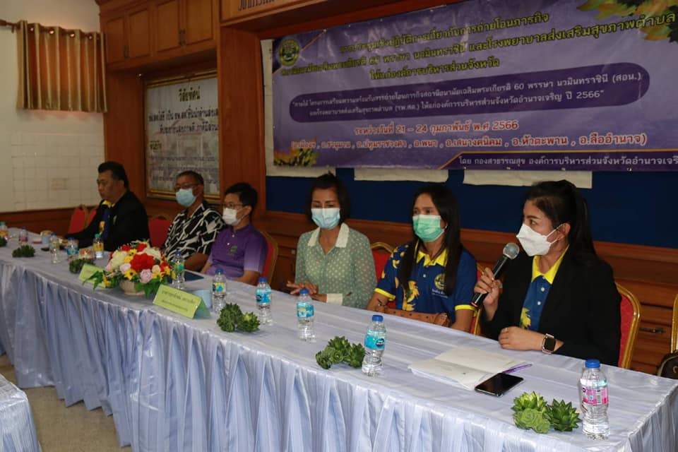 23 กุมภาพันธ์ 2566 นางสาววันเพ็ญ ตั้งสกุล นายกองค์การบริหารส่วนจังหวัดอำนาจเจริญ พร้อมด้วย สมาชิกสภา อบจ.อำนาจเจริญ และหัวหน้าส่วนราชการ ข้าราชการ บุคลากรในสังกัดฯ ร่วมโครงการประชุมเชิงปฏิบัติการเกี่ยวกับการถ่ายโอนภารกิจสถานีอนามัยเฉลิมพระเกียรติ 60 พรรษา นวมินทราชินีและโรงพยาบาลส่งเสริมสุขภาพตำบลให้แก่องค์การบริหารส่วนจังหวัดอำนาจเจริญ เพื่อดำเนินการเตรียมความพร้อมในการสร้างกลไกขับเคลื่อนภารกิจ รวมถึงการพัฒนาและเสริมสร้างศักยภาพเครือข่ายให้แก่เจ้าหน้าที่ผู้ปฏิบัติงานในเขตพื้นที่อำเภอเมือง "ประชาชนสุขภาพดี เจ้าหน้าที่มีความสุข ระบบสุขภาพยั่งยืน"