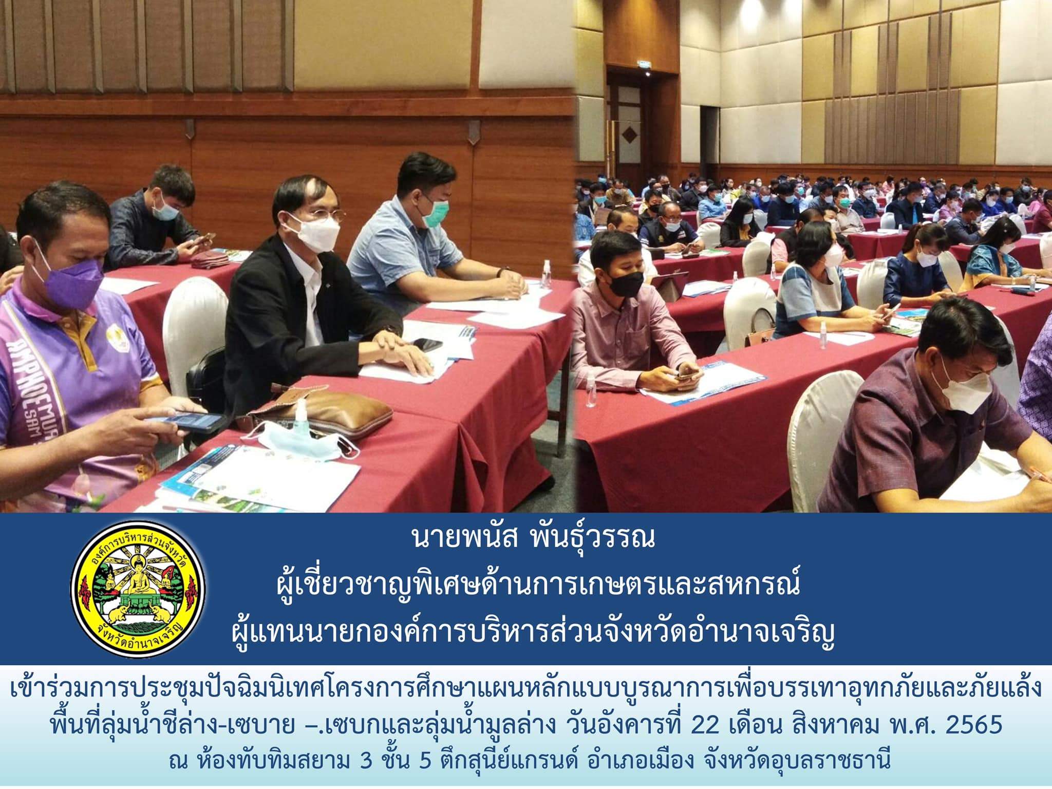 22 สิงหาคม 2565เวลา 08.00 น. นายพนัส พันธุ์วรรณ ผู้เชี่ยวชาญพิเศษด้านการเกษตรและสหกรณ์ เป็นผู้แทน นางสาววันเพ็ญ ตั้งสกุล นายกองค์การบริหารส่วนจังหวัดอำนาจเจริญ เข้าร่วมการประชุมปัจฉิมนิเทศโครงการศึกษาแผนหลักแบบบูรณาการเพื่อบรรเทาอุทกภัยและภัยแล้ง พื้นที่ลุ่มน้ำชีล่าง-เซบาย – เซบกและลุ่มน้ำมูลล่าง ณ ห้องทับทิมสยาม3 ชั้น 5 ตึกสุนีย์แกรนด์ อำเภอเมือง จังหวัดอุบลราชธานี