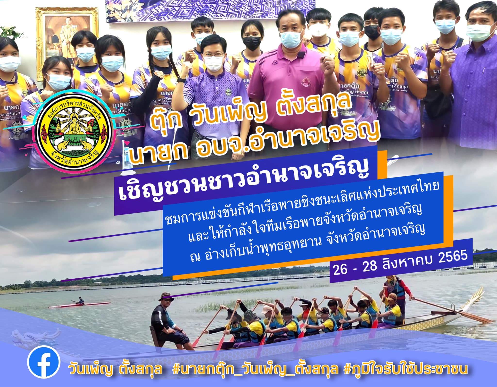 นางสาววันเพ็ญ ตั้งสกุล นายกองค์การบริหารส่วนจังหวัดอำนาจเจริญ เชิญชวนชาวจังหวัดอำนาจเจริญ ร่วมชมการแข่งขันกีฬาเรือพาย ชิงชนะเลิศแห่งประเทศไทย สนามที่ 2 ประจำปี 2565 และร่วมให้กำลังใจนักกีฬาเรือพายจังหวัดอำนาจเจริญ ณ อ่างเก็บน้ำเก็บน้ำพุทธอุทยาน จังหวัดอำนาจเจริญ ระหว่างวันที่ 26-28 สิงหาคม 2565