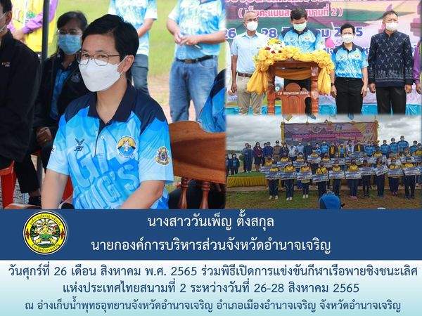 26 สิงหาคม 2565 เวลา 09.00 น. นางสาววันเพ็ญ ตั้งสกุล นายกองค์การบริหารส่วนจังหวัดอำนาจเจริญ ร่วมพิธีเปิดการแข่งขันกีฬาเรือพายชิงชนะเลิศแห่งประเทศไทยสนามที่ 2 ระหว่างวันที่ 26-28 สิงหาคม 2565 โดยมี นายธนูสินธ์ ไชยสิริ รองผู้ว่าราชการจังหวัดอำนาจเจริญ เป็นประธานในพิธี ณ อ่างเก็บน้ำพุทธอุทยานจังหวัดอำนาจเจริญ อำเภอเมืองอำนาจเจริญ จังหวัดอำนาจเจริญ