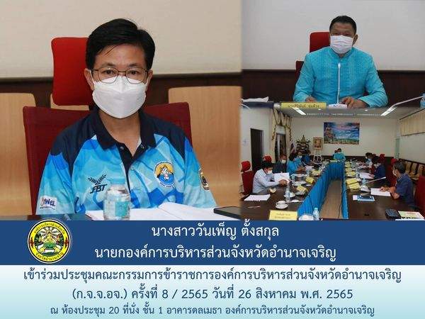 26 สิงหาคม 2565 เวลา 11.00 น. นางสาววันเพ็ญ ตั้งสกุล นายกองค์การบริหารส่วนจังหวัดอำนาจเจริญ เข้าร่วมประชุมคณะกรรมการข้าราชการองค์การบริหารส่วนจังหวัดอำนาจเจริญ (ก.จ.จ.อจ.) ครั้งที่ 8 / 2565 โดยมี นายศิริพันธ์ ขุ่มด้วง รองผู้ว่าราชการจังหวัดอำนาจเจริญ เป็นประธานในการประชุม ณ ห้องประชุม 20 ที่นั่ง อาคารดลเมธา ชั้น 1 องค์การบริหารส่วนจังหวัดอำนาจเจริญ