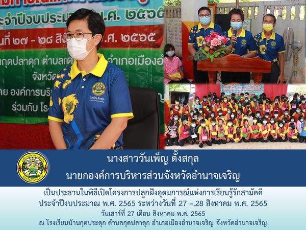 27 สิงหาคม 2565 เวลา 09.00 น. นางสาววันเพ็ญ ตั้งสกุล นายกองค์การบริหารส่วนจังหวัดอำนาจเจริญ เป็นประธานในพิธีเปิดโครงการปลูกฝังอุดมการณ์แห่งการเรียนรู้รักสามัคคี ประจำปีงบประมาณ พ.ศ. 2565 ระหว่างวันที่ 27 – 28 สิงหาคม พ.ศ. 2565 ณ โรงเรียนบ้านกุดประดุก ตำบลกุดปลาดุก อำเภอเมืองอำนาจเจริญ จังหวัดอำนาจเจริญ