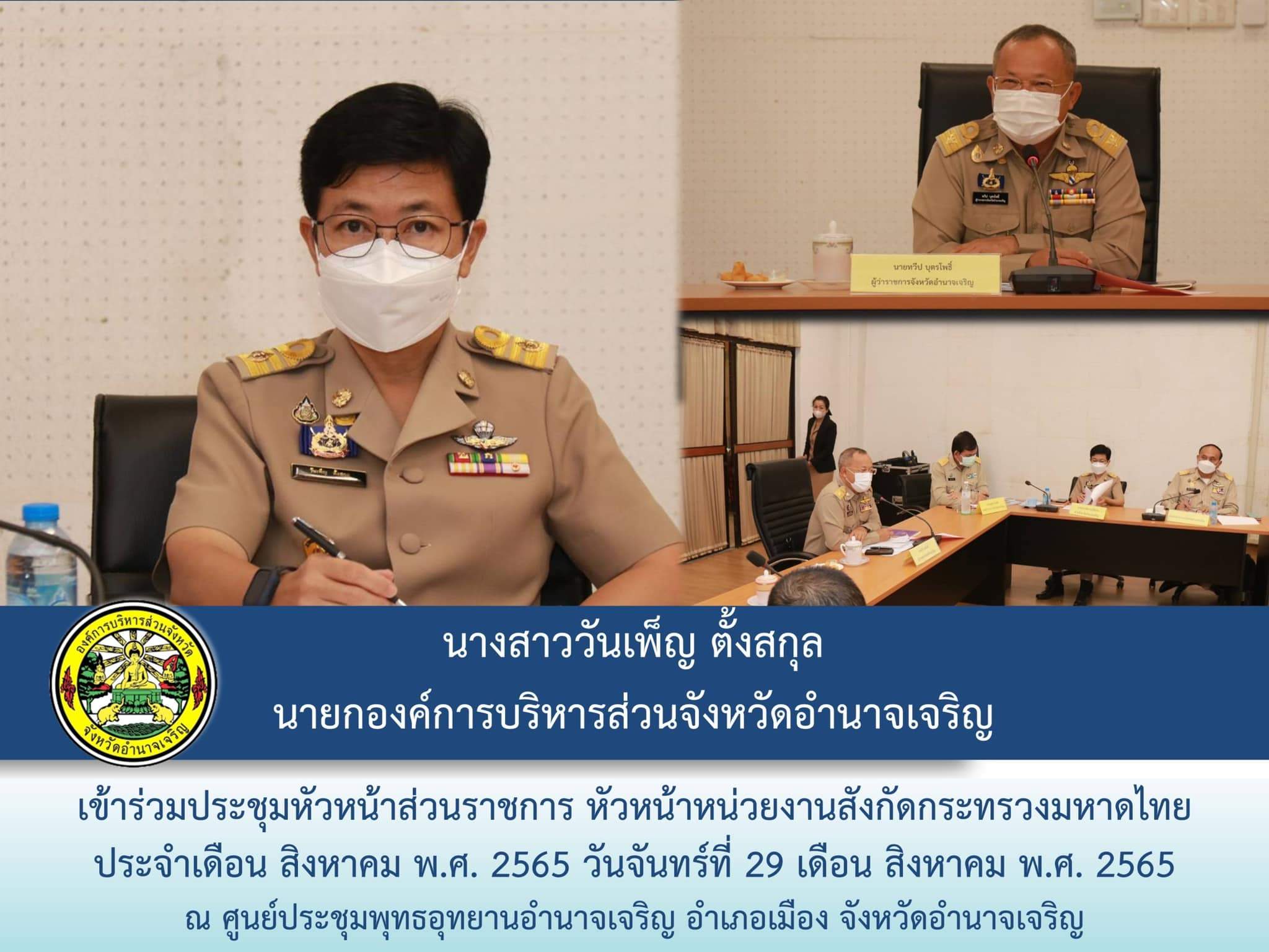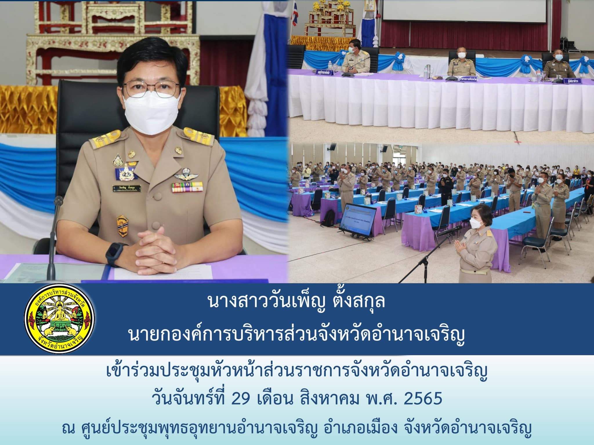 29 สิงหาคม 2565 เวลา 07.00 น. นางสาววันเพ็ญ ตั้งสกุล นายกองค์การบริหารส่วนจังหวัดอำนาจเจริญ เข้าร่วมประชุมหัวหน้าส่วนราชการหัวหน้าหน่วยงานสังกัดกระทรวงมหาดไทย ประจำเดือน สิงหาคม พ.ศ. 2565 โดยมี นายทวีป บุตรโพธิ์ ผู้ว่าราชการจังหวัดอำนาจเจริญ เป็นประธานในการประชุม ณ ศูนย์ประชุมพุทธอุทยานอำนาจเจริญ อำเภอเมือง จังหวัดอำนาจเจริญ