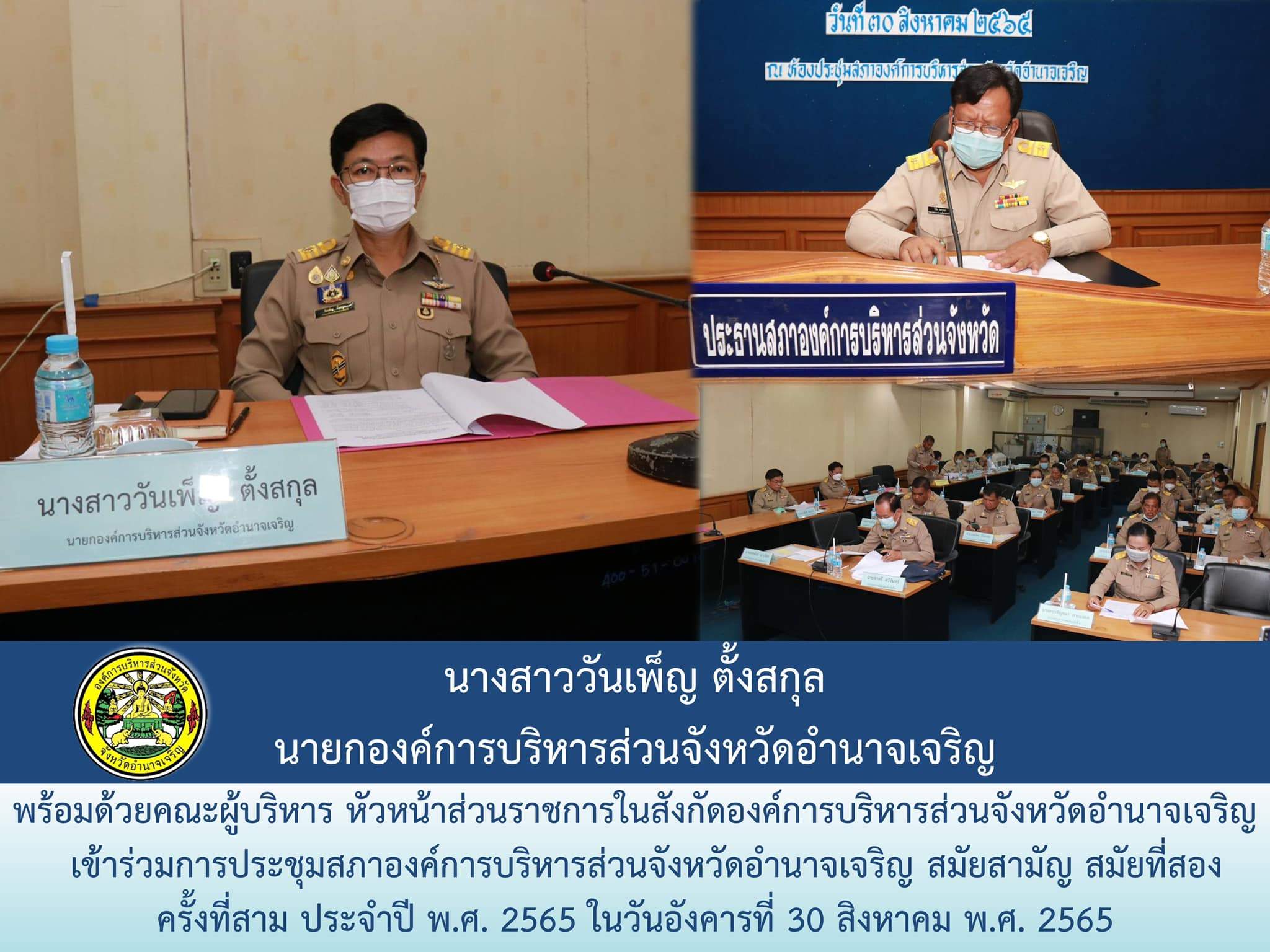 30 สิงหาคม 2565 เวลา 10.00 น. นางสาววันเพ็ญ ตั้งสกุล นายกองค์การบริหารส่วนจังหวัดอำนาจเจริญ พร้อมด้วยคณะผู้บริหาร สมาชิกสภาองค์การบริหารส่วนจังหวัดอำนาจเจริญ หัวหน้าส่วนราชการ ข้าราชการ ในสังกัดองค์การบริหารส่วนจังหวัดอำนาจเจริญ เข้าร่วมการประชุมสภาองค์การบริหารส่วน จังหวัดอำนาจเจริญ สมัยสามัญ สมัยที่สอง ครั้งที่สาม ประจำปี พ.ศ. 2565 โดยมี นายวิชัย แสวงสุข ประธานสภาองค์การบริหารส่วนจังหวัดอำนาจเจริญ เป็นประธานในการประชุม ณ ห้องประชุมสภาองค์การบริหารส่วนจังหวัดอำนาจเจริญ