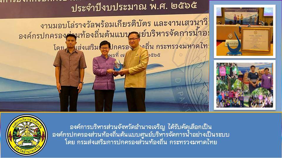 นางสาววันเพ็ญ ตั้งสกุล นายกองค์การบริหารส่วนจังหวัดอำนาจเจริญ ขึ้นรับโล่รางวัลพร้อมเกียรติบัตร ที่องค์การบริหารส่วนจังหวัดอำนาจเจริญได้รับคัดเลือกเป็น องค์กรปกครองส่วนท้องถิ่นต้นแบบศูนย์บริหารจัดการน้ำ อย่างเป็นระบบ ประจำปีงบประมาณ 2565 โดยกรมส่งเสริมการปกครองท้องถิ่น กระทรวงมหาดไทย ณ โรงแรมปรินซ์ ลาเลซ มหานาค กรุงเทพมหานคร