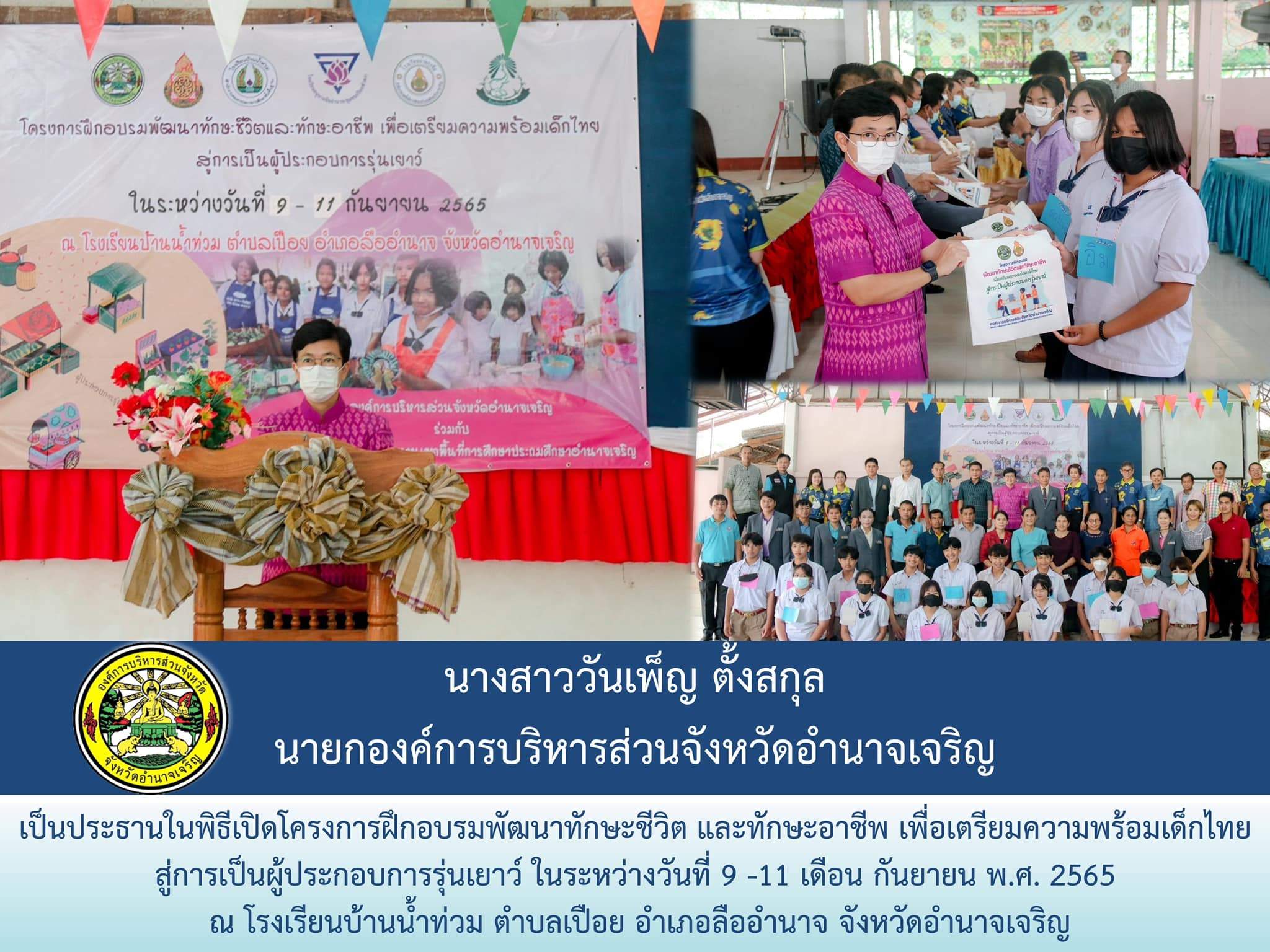 9 กันยายน 2565 เวลา 09.00 น. นางสาววันเพ็ญ ตั้งสกุล นายกองค์การบริหารส่วนจังหวัดอำนาจเจริญ เป็นประธานในพิธีเปิดโครงการฝึกอบรมพัฒนาทักษะชีวิตและทักษะอาชีพ เพื่อเตรียมความพร้อมเด็กไทยสู่การเป็นผู้ประกอบการรุ่นเยาว์ ในระหว่างวันที่ 9 -11 เดือน กันยายน พ.ศ. 2565 ณ โรงเรียนบ้านน้ำท่วม ตำบลเปือย อำเภอลืออำนาจ จังหวัดอำนาจเจริญ