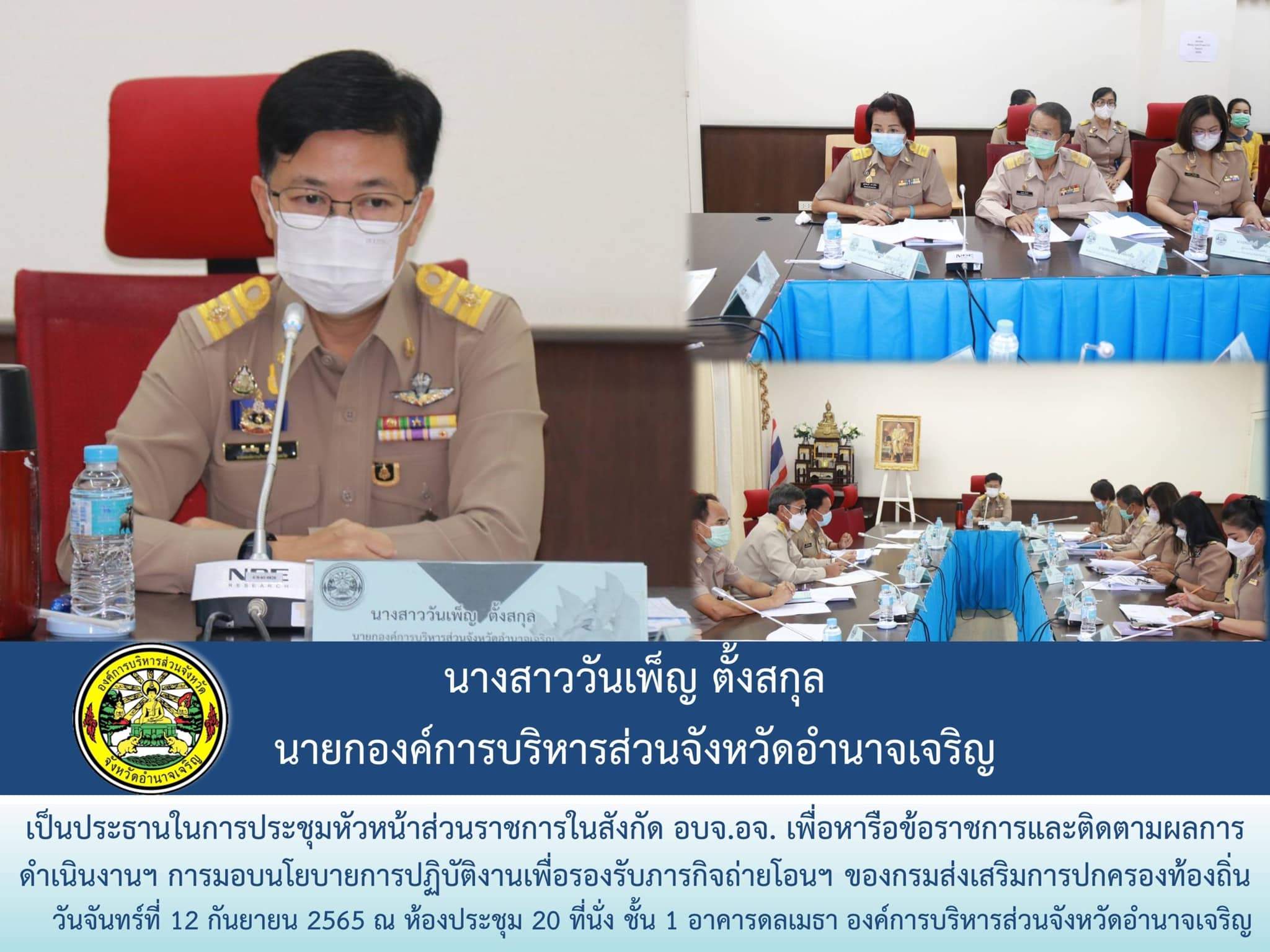 12 กันยายน 2565 เวลา 09.30 น. นางสาววันเพ็ญ ตั้งสกุล นายกองค์การบริหารส่วนจังหวัดอำนาจเจริญเป็นประธานในการประชุมหัวหน้าส่วนราชการสังกัด องค์การบริหารส่วนจังหวัดอำนาจเจริญ เพื่อหารือ ข้อราชการและติดตามผลการดำเนินงานฯ การมอบนโยบายการปฏิบัติงาน เพื่อรองรับภารกิจถ่ายโอนฯ ของกรมส่งเสริมการปกครองท้องถิ่น ณ ห้องประชุม 20 ที่นั่ง ชั้น 1 อาคารดลเมธา องค์การบริหารส่วนจังหวัดอำนาจเจริญ
