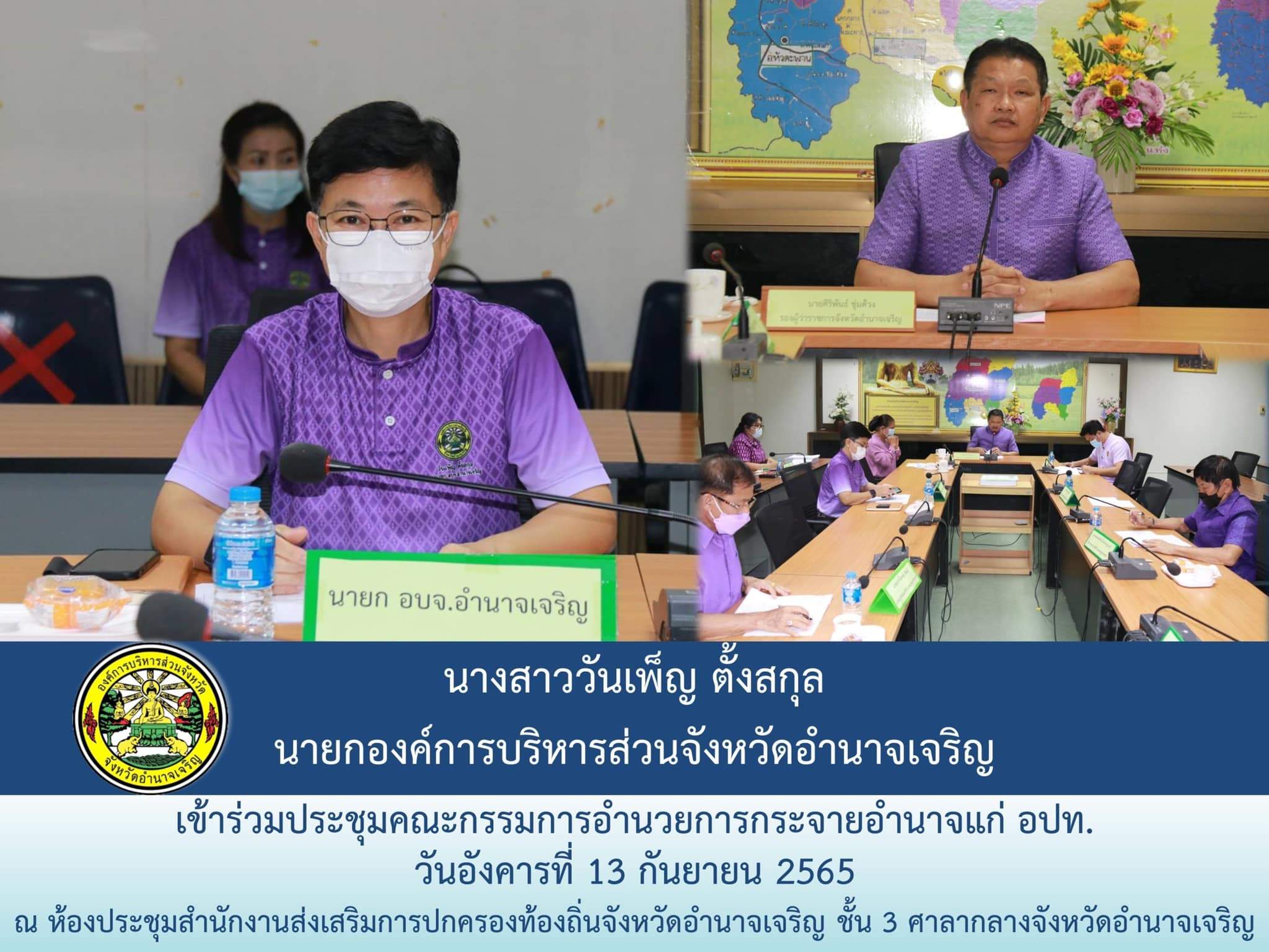 13 กันยายน 2565 เวลา 14.00 น. นางสาววันเพ็ญ ตั้งสกุล นายกองค์การบริหารส่วนจังหวัดอำนาจเจริญ เข้าร่วมประชุมคณะกรรมการอำนวยการกระจายอำนาจแก่ อปท. โดยมี นายศิริพันธ์ ขุ่มด้วง รองผู้ว่าราชการจังหวัดอำนาจเจริญ เป็นประธานในการประชุม ณ ห้องประชุมสำนักงานส่งเสริมการปกครองท้องถิ่นจังหวัดอำนาจเจริญ ชั้น 3 ศาลากลางจังหวัดอำนาจเจริญ
