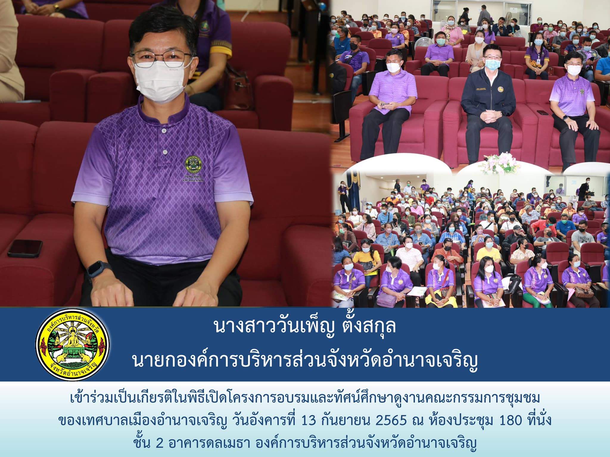 13 กันยายน 2565 เวลา 09.00 น. นางสาววันเพ็ญ ตั้งสกุล นายกองค์การบริหารส่วนจังหวัดอำนาจเจริญ พร้อมคณะผู้บริหาร เข้าร่วมเป็นเกียรติในพิธีเปิดโครงการอบรมและทัศน์ศึกษาดูงานคณะกรรมการชุมชมของเทศบาลเมืองอำนาจเจริญ โดยมี นายณัฐพงค์ ตั้งสกุลกุลพัฒน์ เป็นประธานในพิธี ณ ห้องประชุม 180 ที่นั่ง ชั้น 2 อาคารดลเมธา องค์การบริหารส่วนจังหวัดอำนาจเจริญ