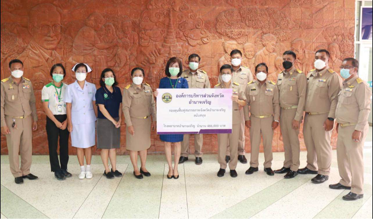 นางสาววันเพ็ญ ตั้งสกุล นายกองค์การบริหารส่วนจังหวัดอำนาจเจริญ พร้อม สมาชิกสภาองค์การบริหารส่วนจังหวัดอำนาจเจริญ มอบเงินสนับสนุนกองทุนฟื้นฟูฯสมรรถภาพจังหวัดอำนาจเจริญ โรงพยาบาลในจังหวัดอำนาจเจริญ