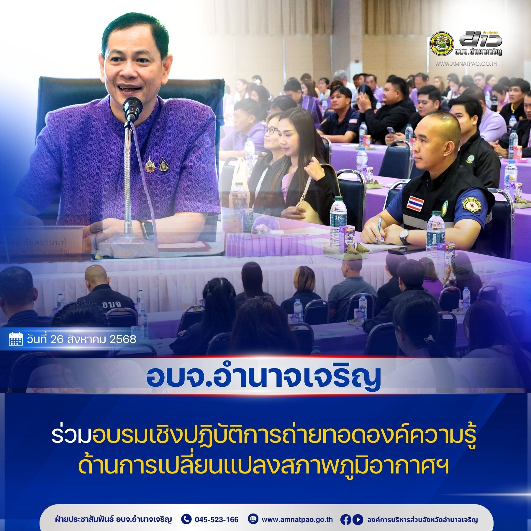 วันที่ 26 สิงหาคม 2568 เวลา 08.30 อบจ.อำนาจเจริญ ร่วมอบรมเชิงปฏิบัติการถ่ายทอดองค์ความรู้ด้านการเปลี่ยนแปลงสภาพภูมิอากาศ การปรับตัวรับมือกับผลกระทบการลดก๊าซเรือนกระจกภาคสมัครใจของประเทศไทย ภายใต้โครงการสร้างความร่วมมือด้านทรัพยากรธรรมชาติและสิ่งแวดล้อมในระดับพื้นที่ เพื่อรองรับการเปลี่ยนแปลงสภาพภูมิอากาศจังหวัดอำนาจเจริญ ประจำปีงบประมาณ พ.ศ. 2568