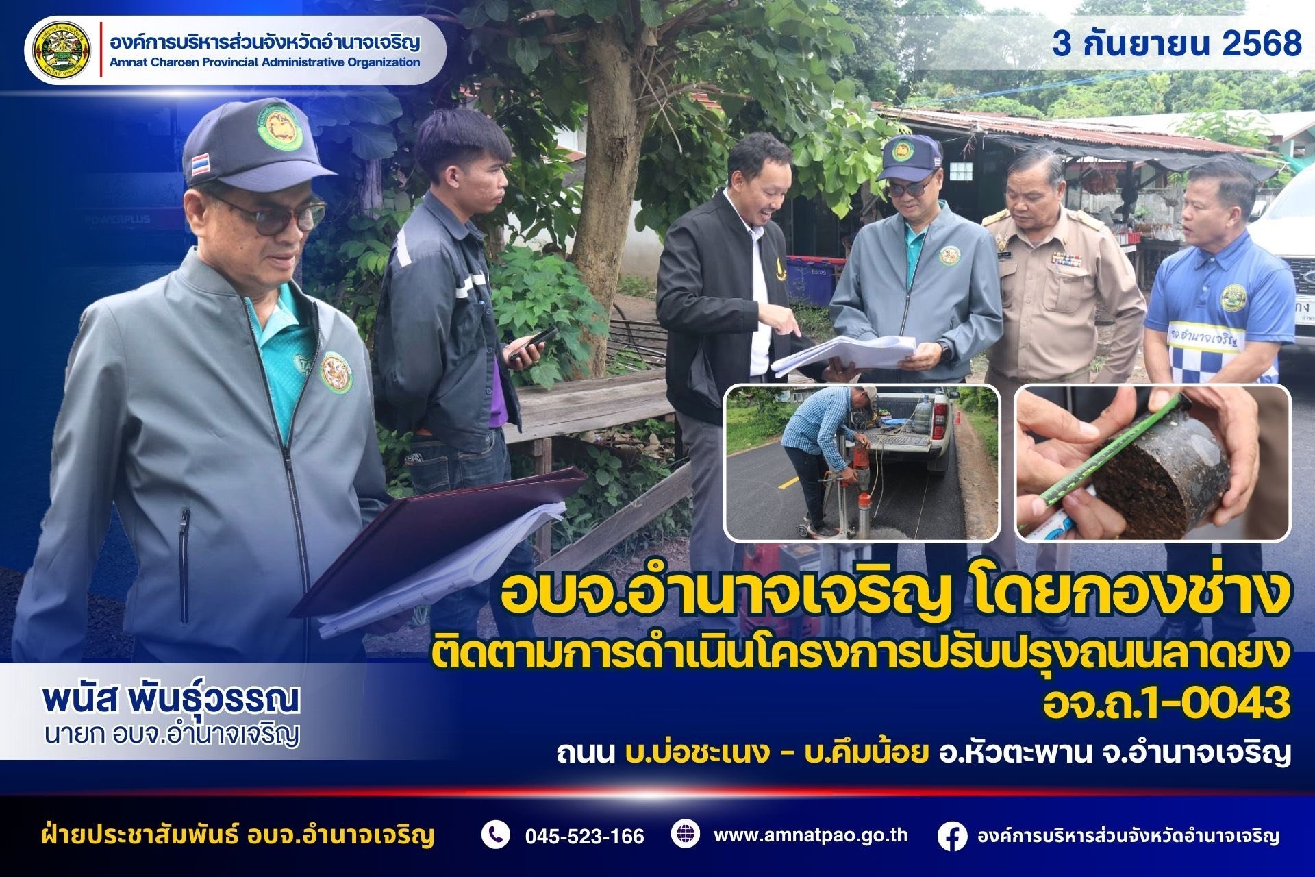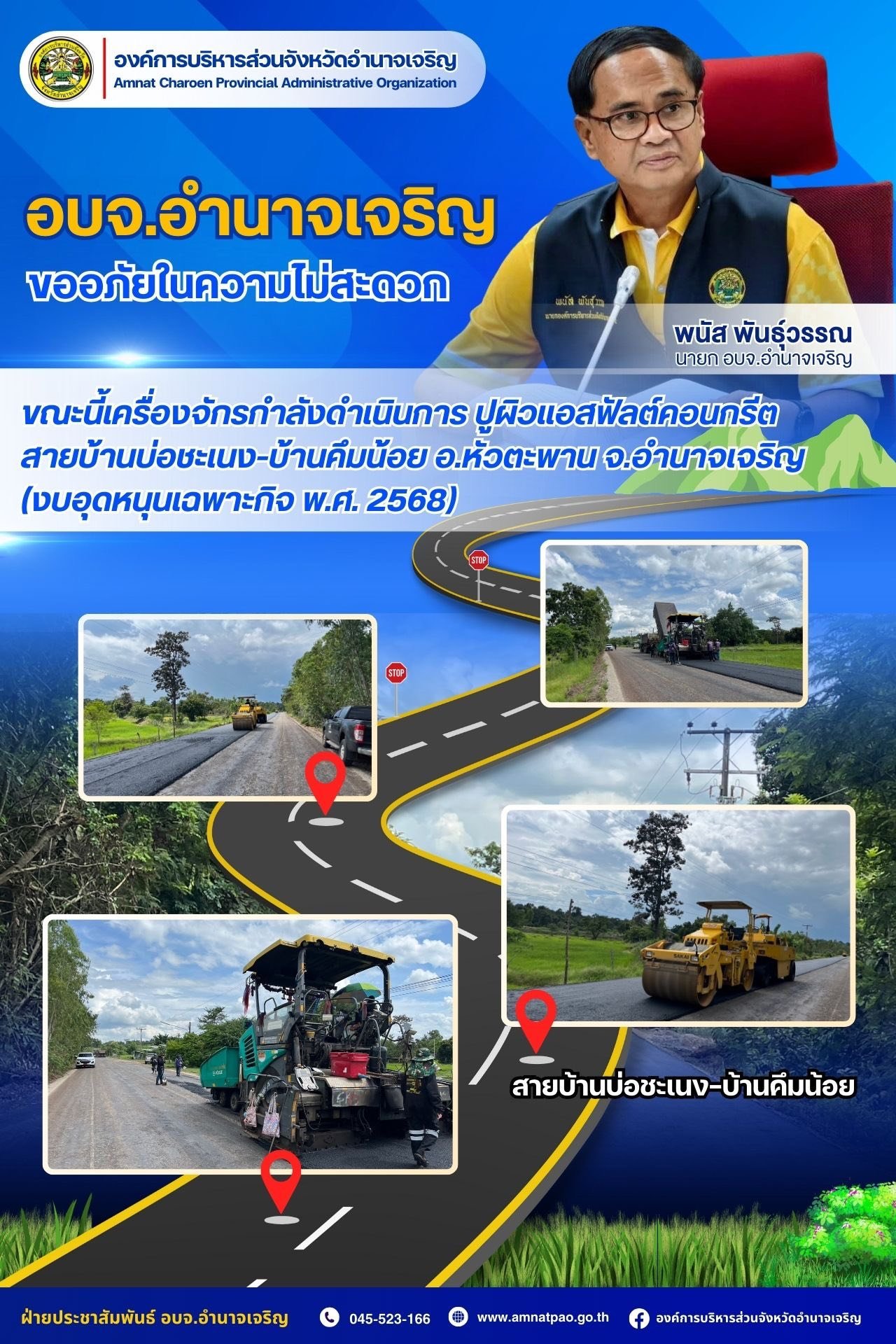 อบจ.อำนาจเจริญ ขออภัยในความไม่สะดวก ขณะนี้กำลังดำเนินการก่อสร้างปรับปรุงถนนปูผิวแอสฟัลต์คอนกรีต บนเส้นทาง บ้านบ่อชะเนง – บ้านคึมน้อย อำเภอหัวตะพาน จังหวัดอำนาจเจริญ ภายใต้งบประมาณอุดหนุนเฉพาะกิจ ประจำปี พ.ศ. 2568