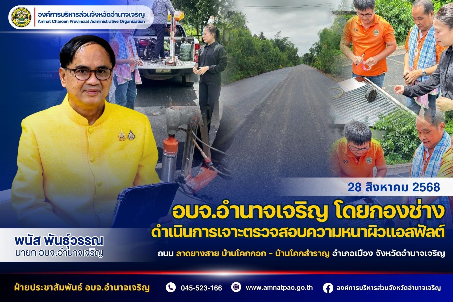 องค์การบริหารส่วนจังหวัดอำนาจเจริญ โดยกองช่าง ดำเนินการ เจาะตรวจสอบความหนาผิวแอสฟัลต์ ถนนลาดยางสาย บ้านโคกกอก – บ้านโคกสำราญ อำเภอเมือง จังหวัดอำนาจเจริญ