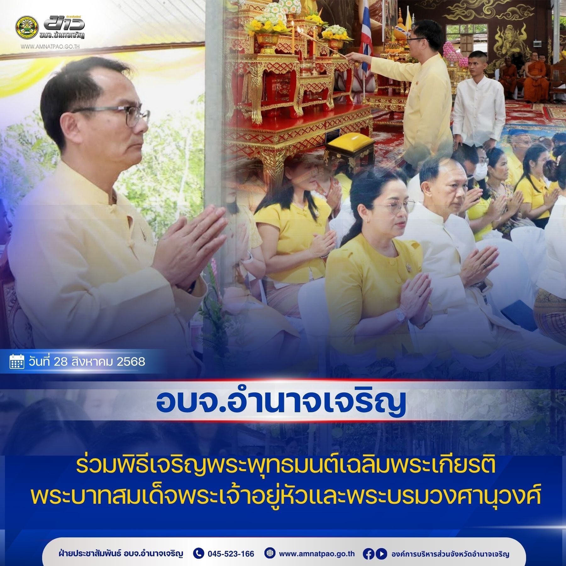 วันนี้ (28 สิงหาคม 2568) เวลา 14.00 น. อบจ.อำนาจเจริญ ร่วมพิธีเจริญพระพุทธมนต์เฉลิมพระเกียรติ พระบาทสมเด็จพระเจ้าอยู่หัวและพระบรมวงศานุวงศ์