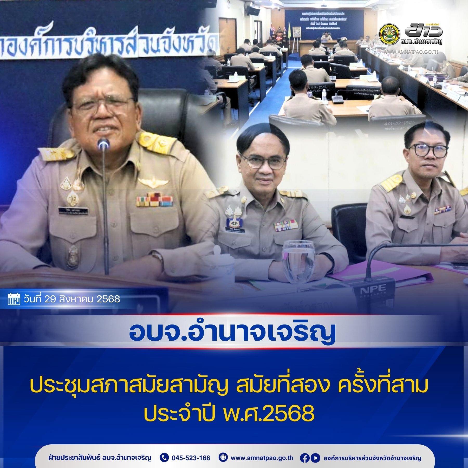 วันที่ (29 สิงหาคม 68) เวลา 10.00 น. อบจ.อำนาเจริญ จัดประชุมสภาสมัยสามัญ สมัยที่สอง ครั้งที่สาม ประจำปี พ.ศ.2568