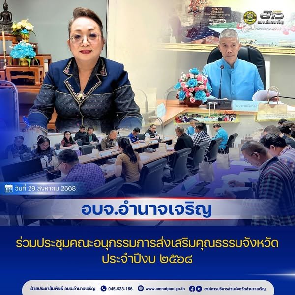 วันที่ (29 สิงหาคม 68) เวลา 10.00 น. อบจ.อำนาจเจริญ ร่วมประชุมคณะอนุกรรมการส่งเสริมคุณธรรมจังหวัดอำนาจเจริญ